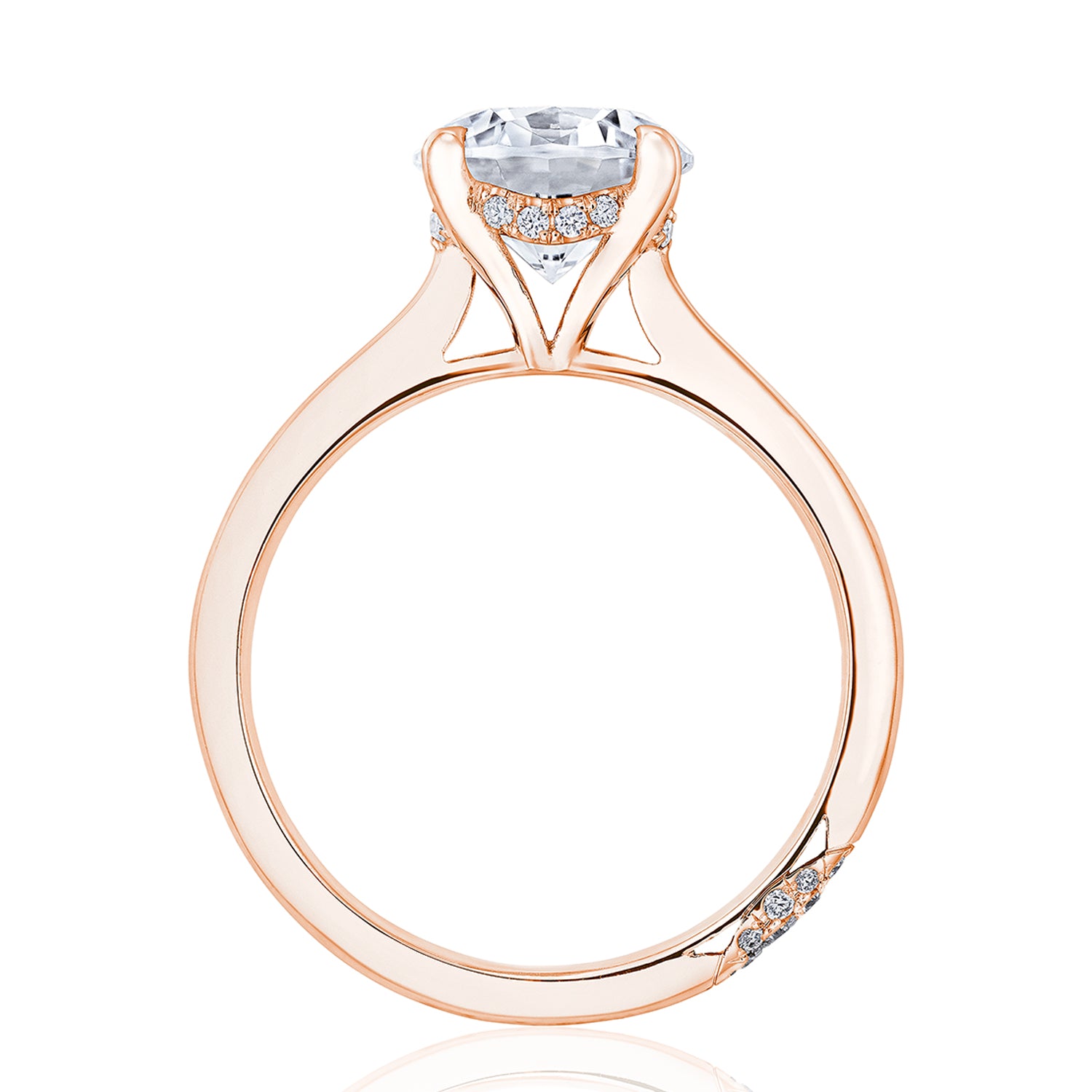 Designed by our Founder, Haig Tacorian, this stunning four-prong, solitaire engagement ring features a round-brilliant cut center stone on a high-polished band. Discover the hidden bloom of diamonds underneath the crown and the diamond-studded crescent signature at the foundation.
