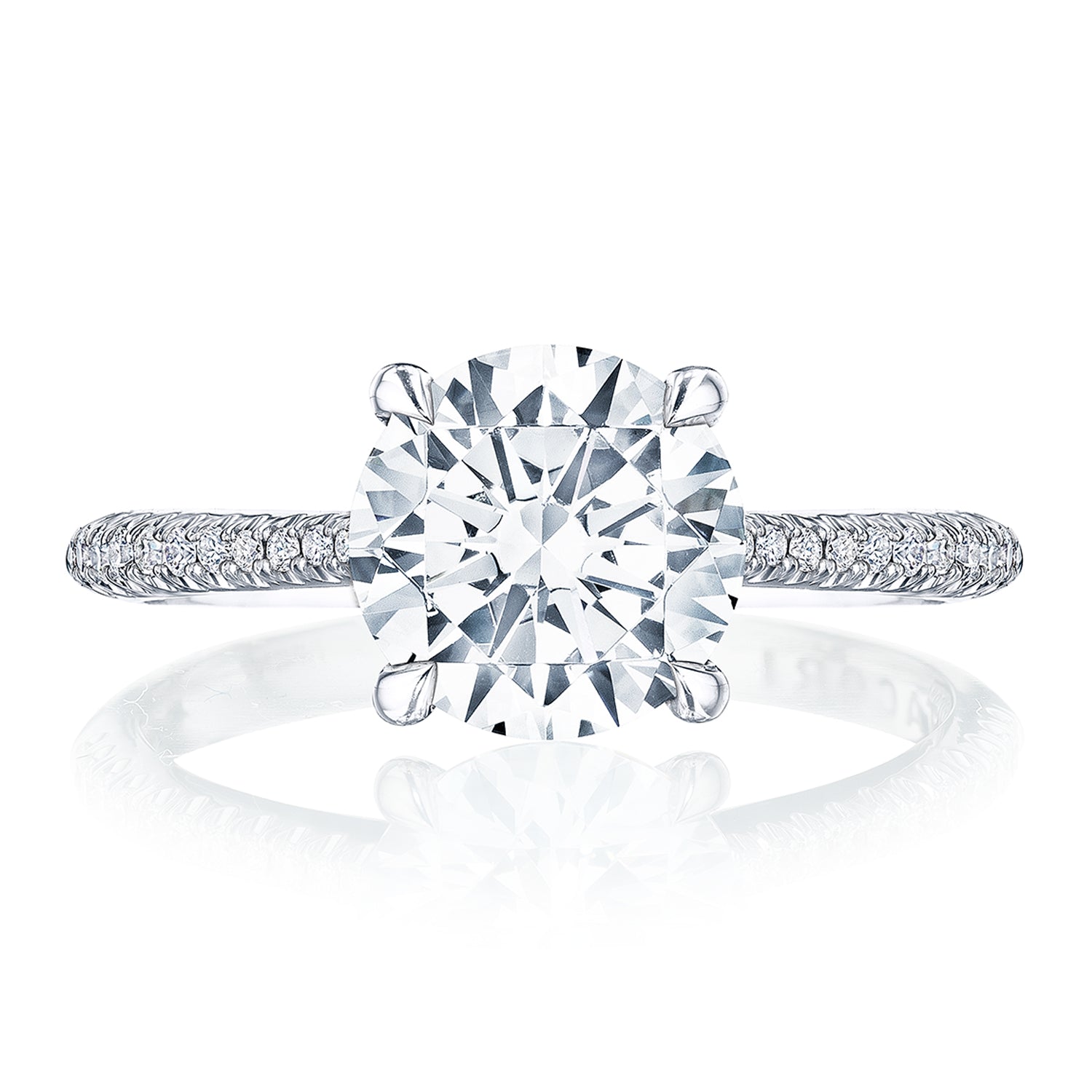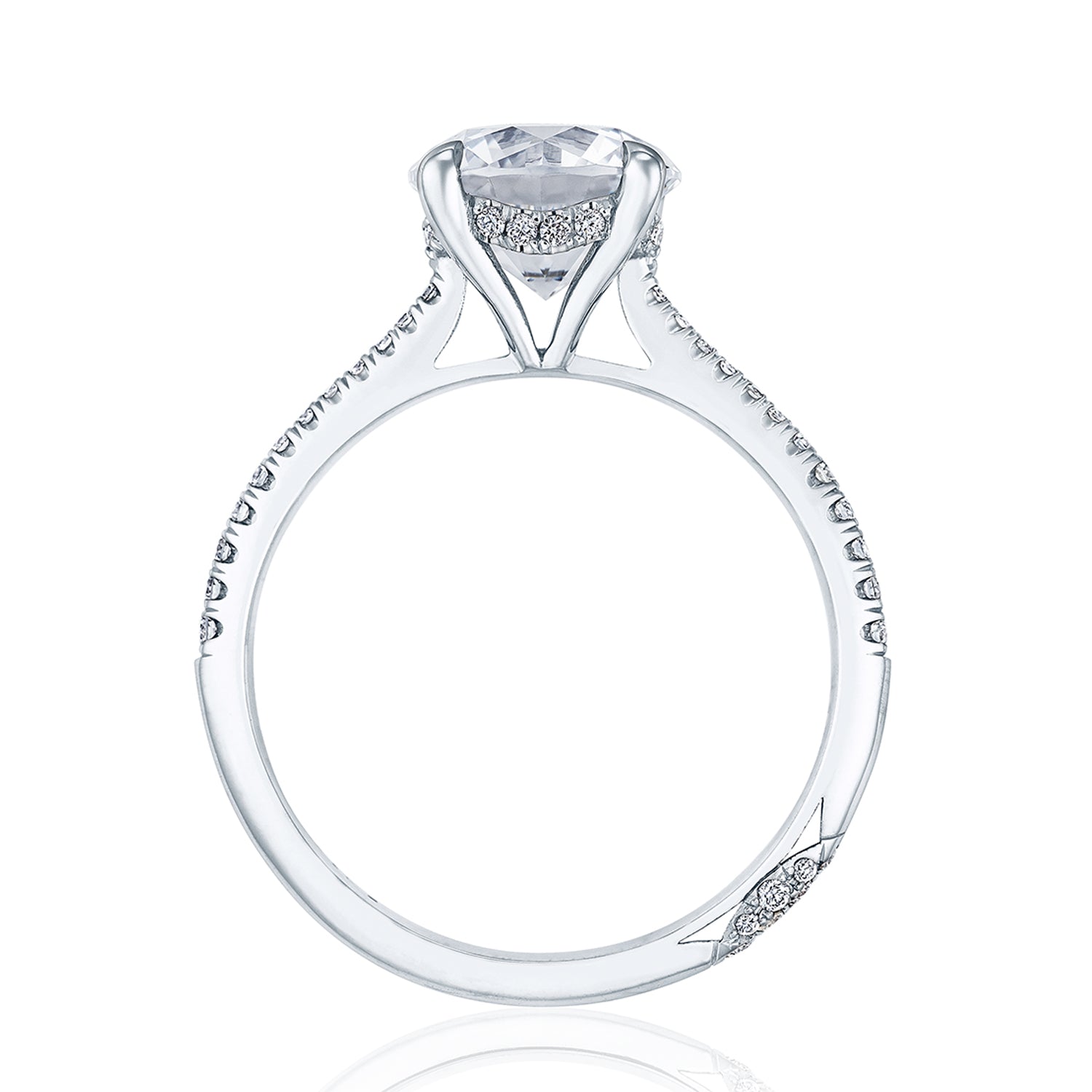 Designed by our Founder, Haig Tacorian, this stunning four-prong, solitaire engagement ring features a round-brilliant cut center stone on a French-pavé set diamond band. Discover the hidden bloom of diamonds underneath the crown and the diamond-studded crescent signature at the foundation.