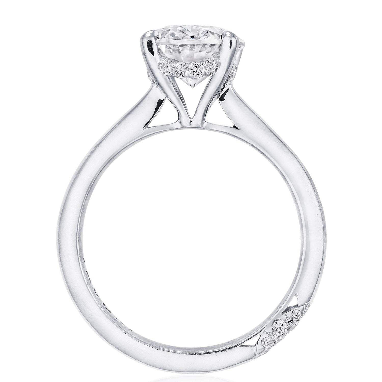 Designed by our Founder, Haig Tacorian, this stunning four-prong, solitaire engagement ring features a round-brilliant center stone on a high-polished band. Discover the hidden bloom of diamonds underneath the crown and the diamond-studded crescent signature at the foundation.