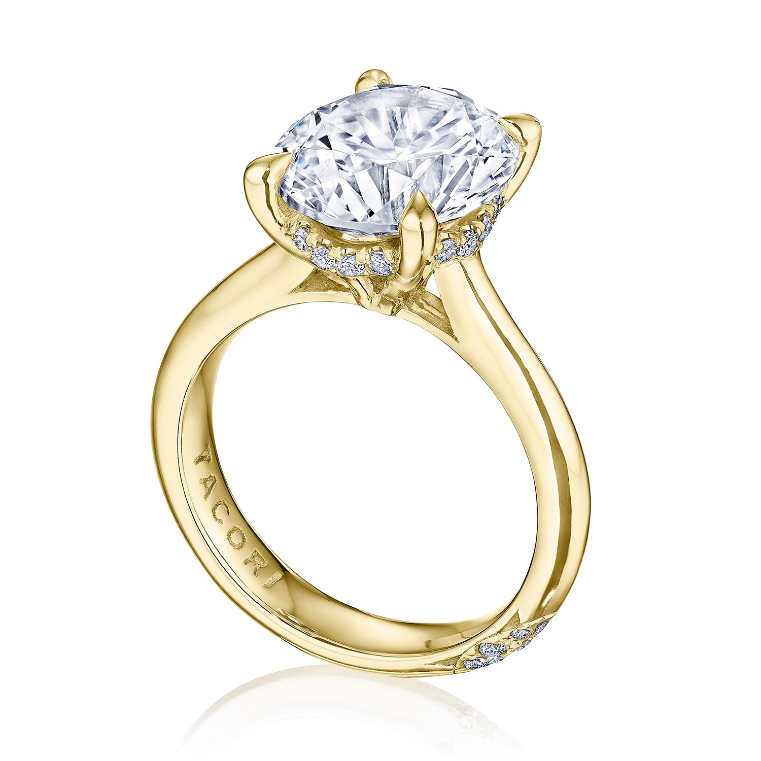 Designed by our Founder, Haig Tacorian, this stunning four-prong, solitaire engagement ring features a round-brilliant center stone on a high-polished band. Discover the hidden bloom of diamonds underneath the crown and the diamond-studded crescent signature at the foundation.