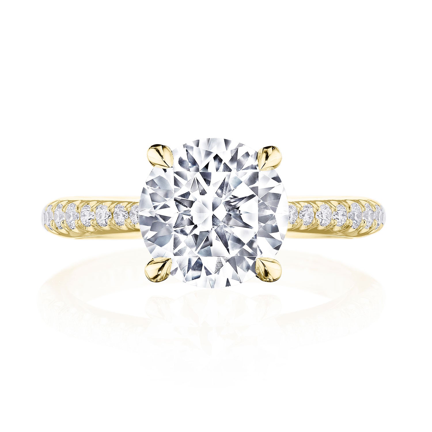 Designed by our Founder, Haig Tacorian, this stunning four-prong, solitaire engagement ring features a round-brilliant center stone on a diamond-intense band. Discover the hidden bloom of diamonds underneath the crown and the diamond-studded crescent signature at the foundation.