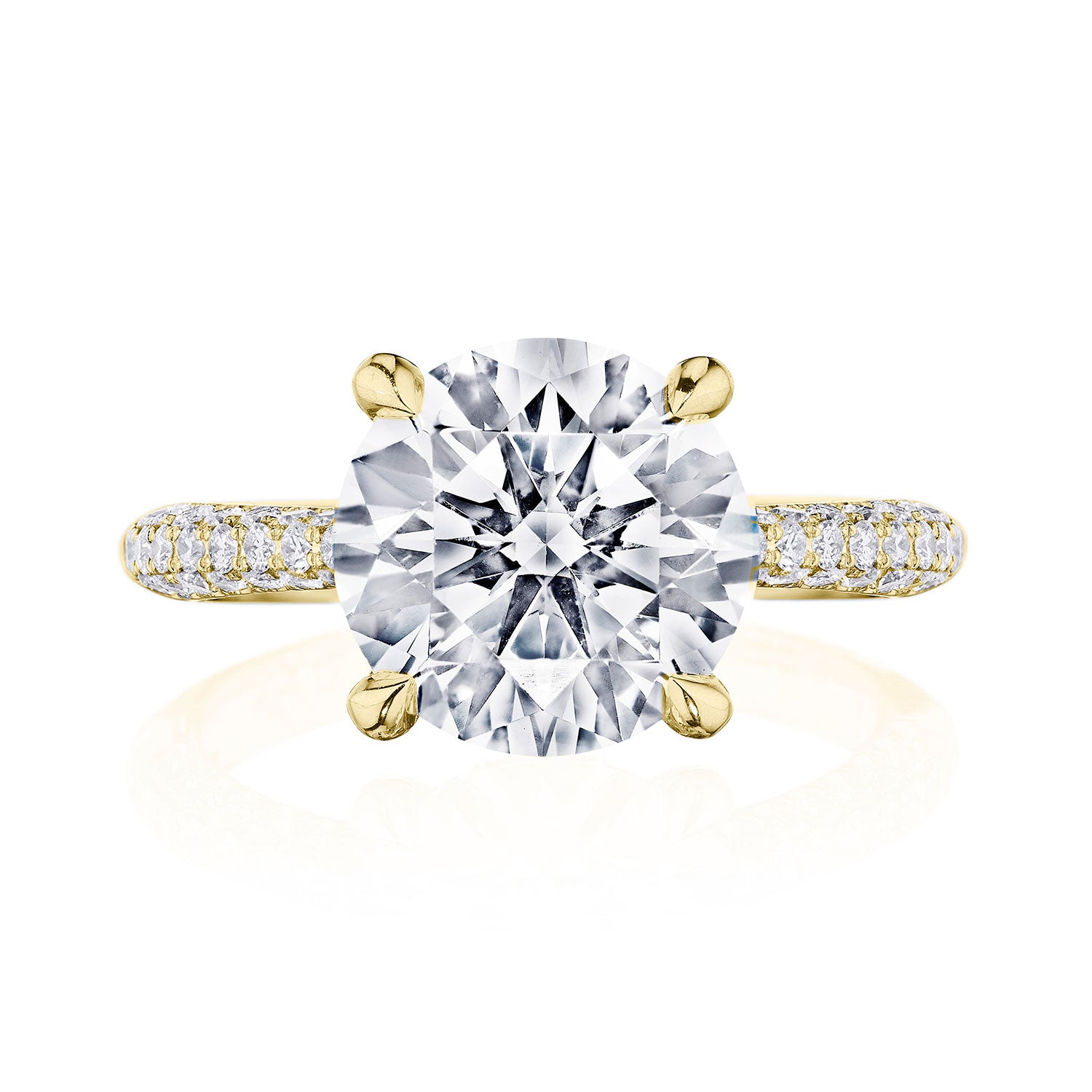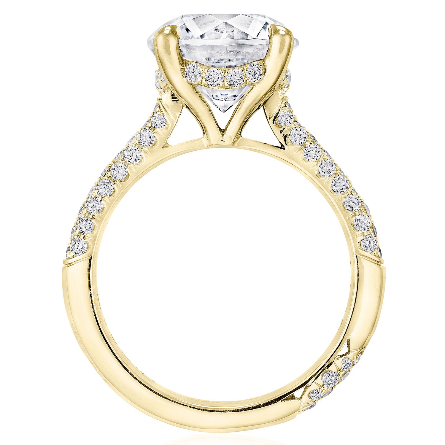 Designed by our Founder, Haig Tacorian, this stunning four-prong, solitaire engagement ring features a round-brilliant center stone on a three-row pavé-set, diamond-intense band. Discover the hidden bloom of diamonds underneath the crown and the diamond-studded crescent signature at the foundation.