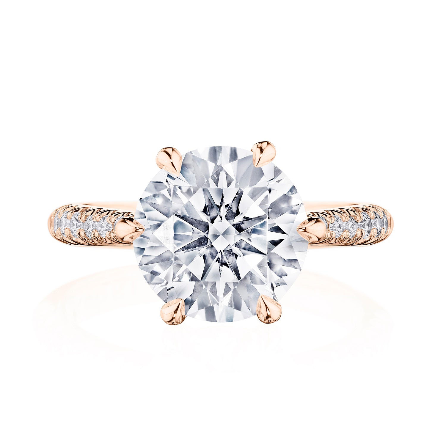 Designed by our Founder, Haig Tacorian, this stunning six-prong, solitaire engagement ring features a round-brilliant center stone on a diamond-intense band. Discover the hidden bloom of diamonds underneath the crown and the diamond-studded crescent signature at the foundation.