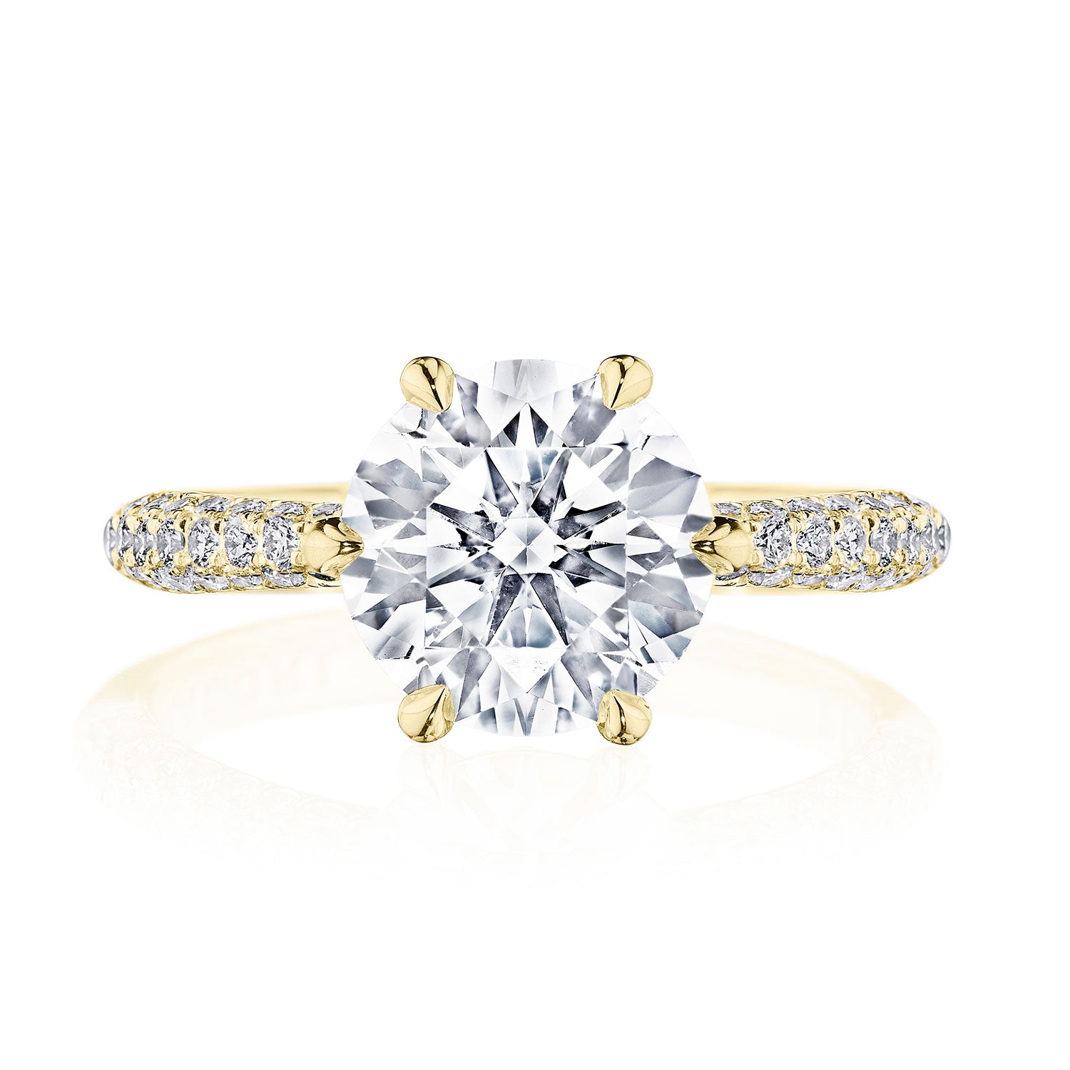 Designed by our Founder, Haig Tacorian, this stunning six-prong, solitaire engagement ring features a round-brilliant center stone on a three-row pavé-set, diamond-intense band. Discover the hidden bloom of diamonds underneath the crown and the diamond-studded crescent signature at the foundation.