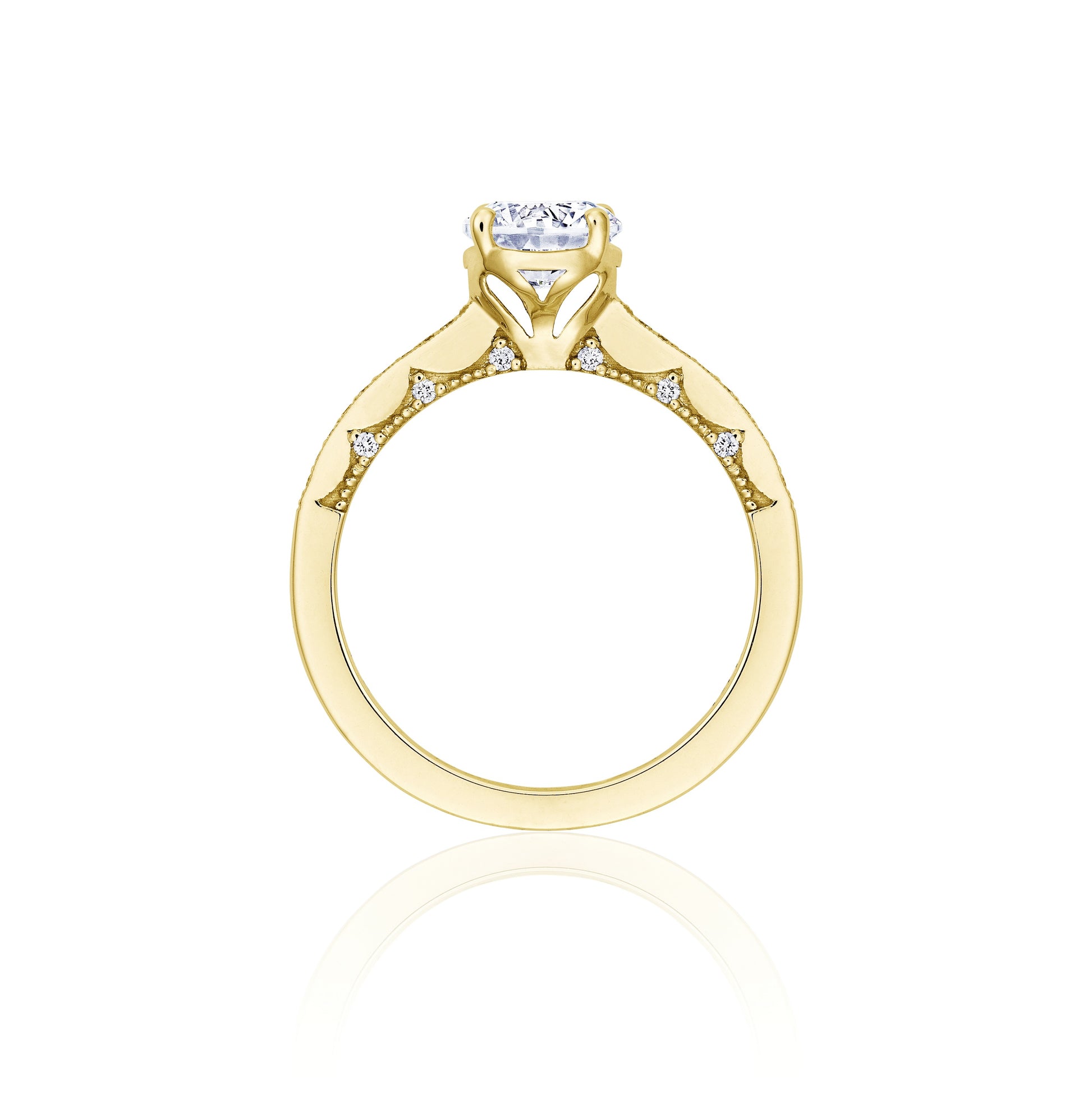 Dainty round-brilliant diamonds decorate the ceiling and lead to the center stone, which embraced by a Cathedral foundation. Coastal Crescent fabric with pinpoint diamond detailing adds a clean texture to the innerface.