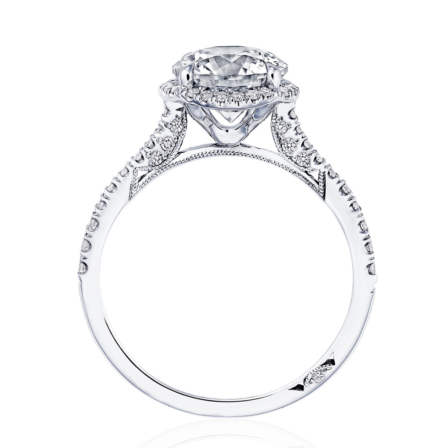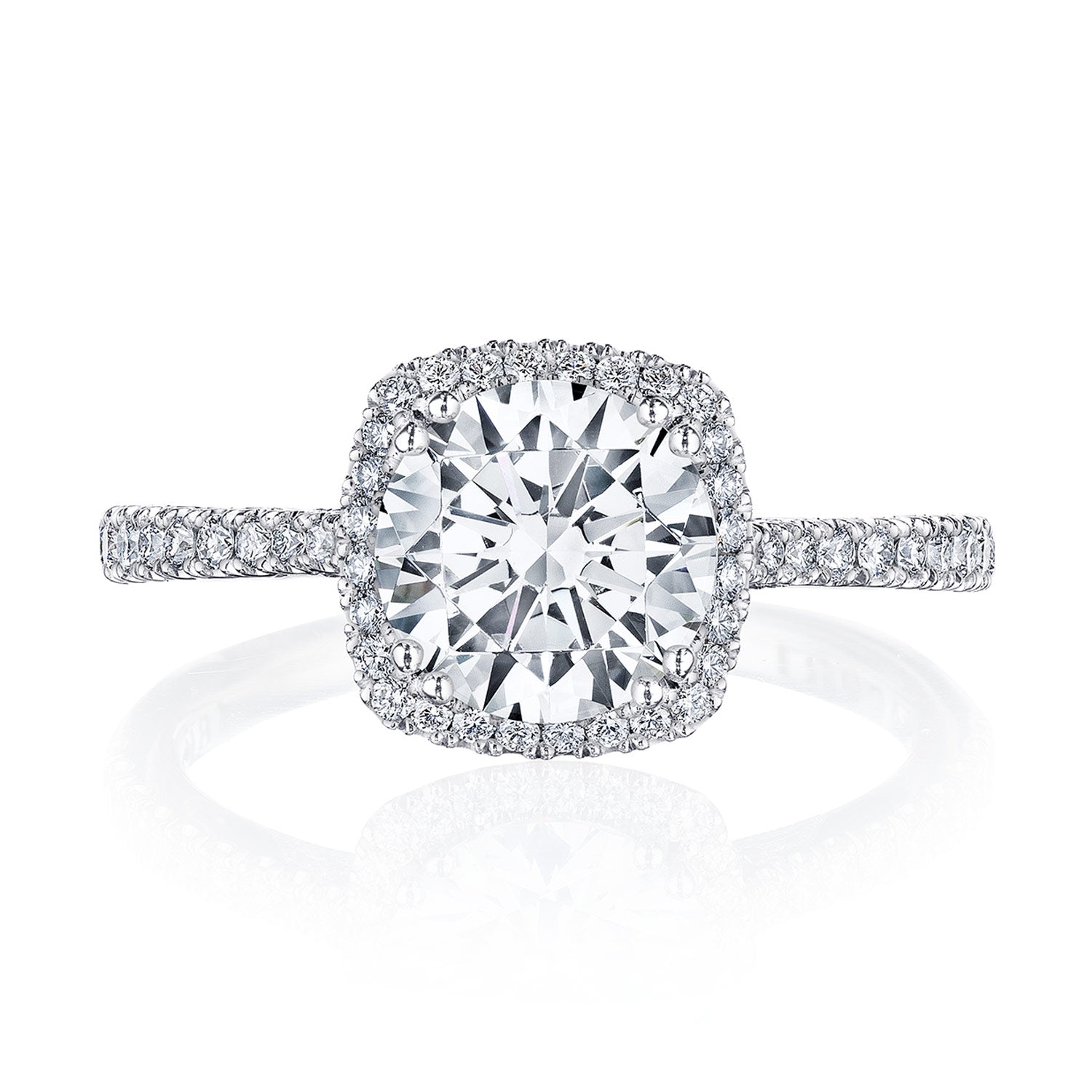 A thin, Simply Tacori Cathedral foundation that delivers brilliant detail, crowned with a round brilliant cut center and cushion shaped bloom. Truly Tacori and totally lovely.