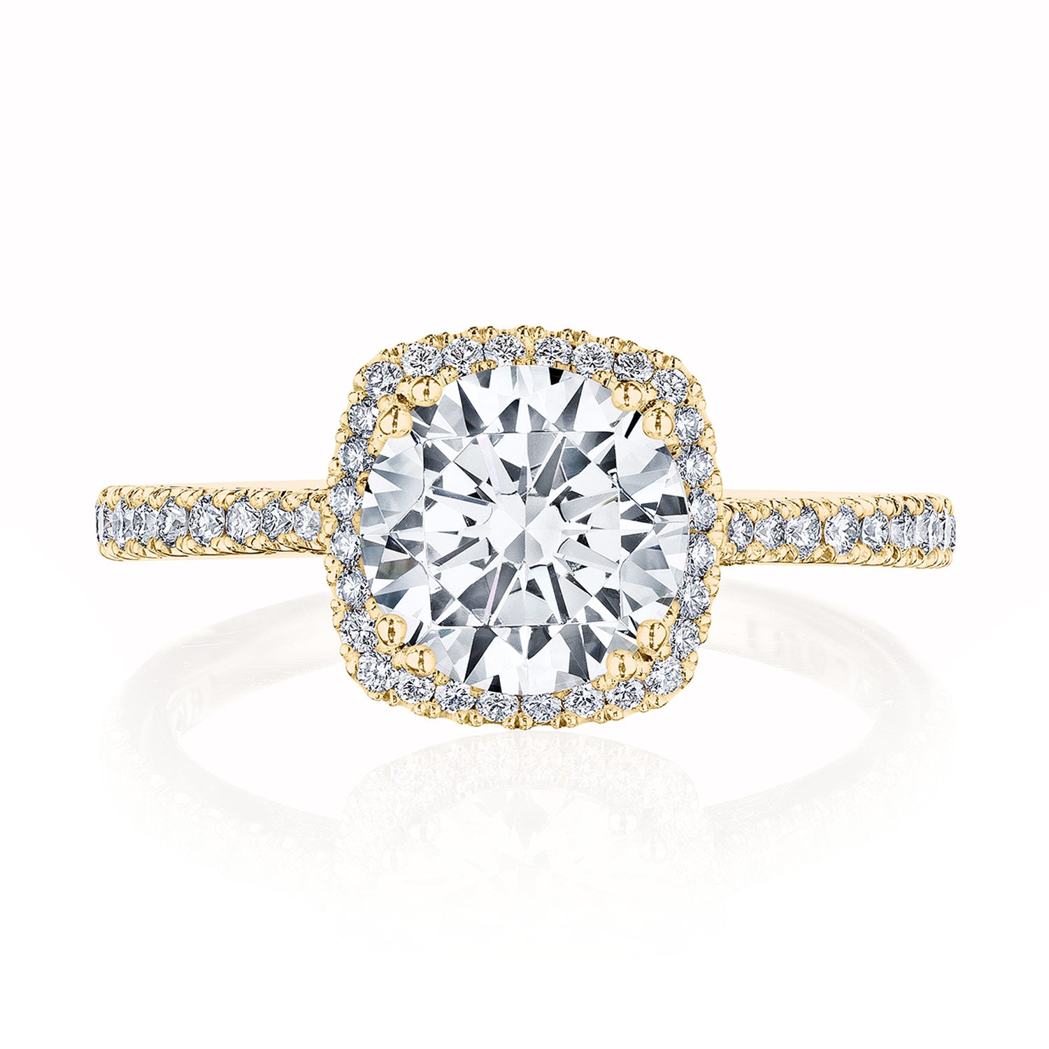 A thin, Simply Tacori Cathedral foundation that delivers brilliant detail, crowned with a round brilliant cut center and cushion shaped bloom. Truly Tacori and totally lovely.