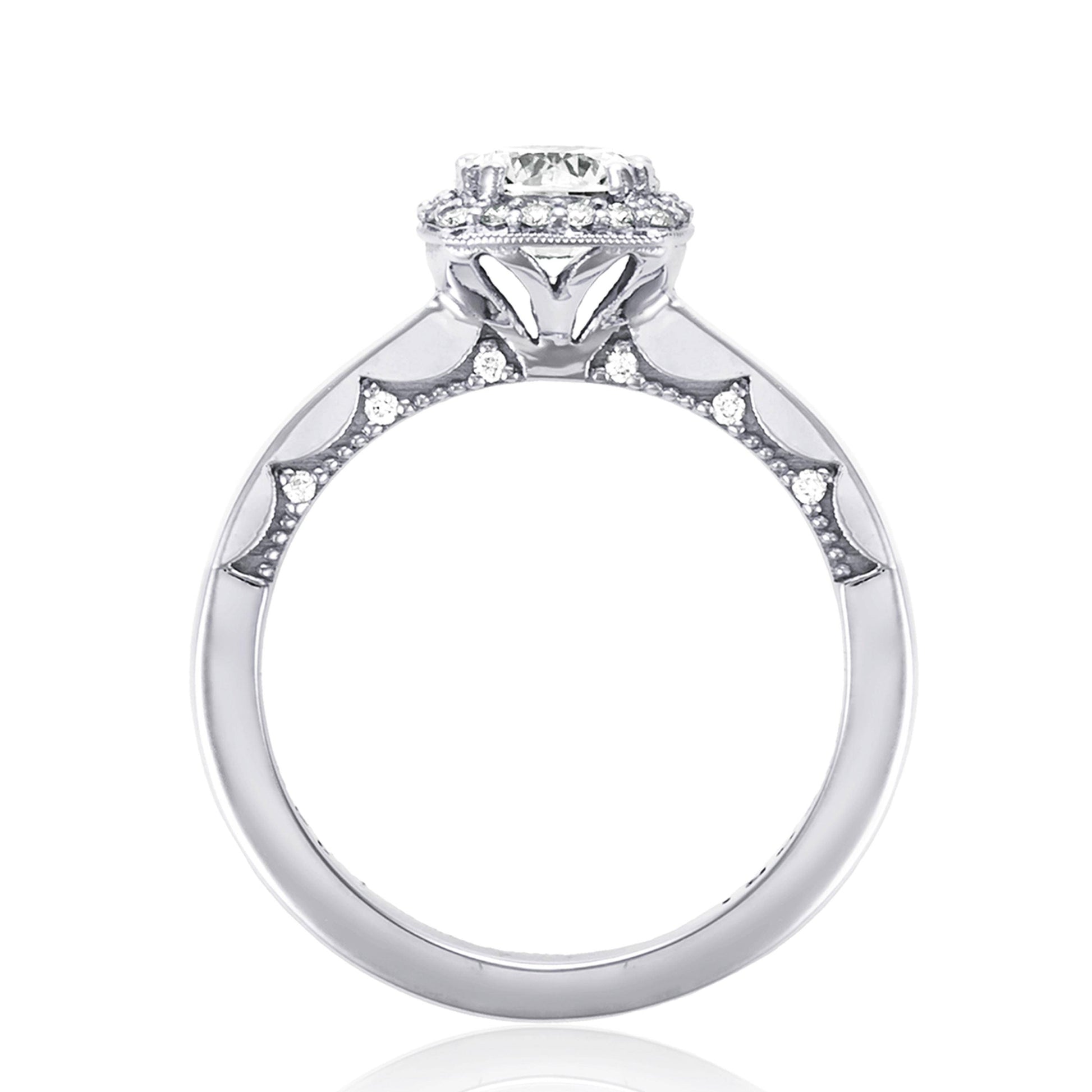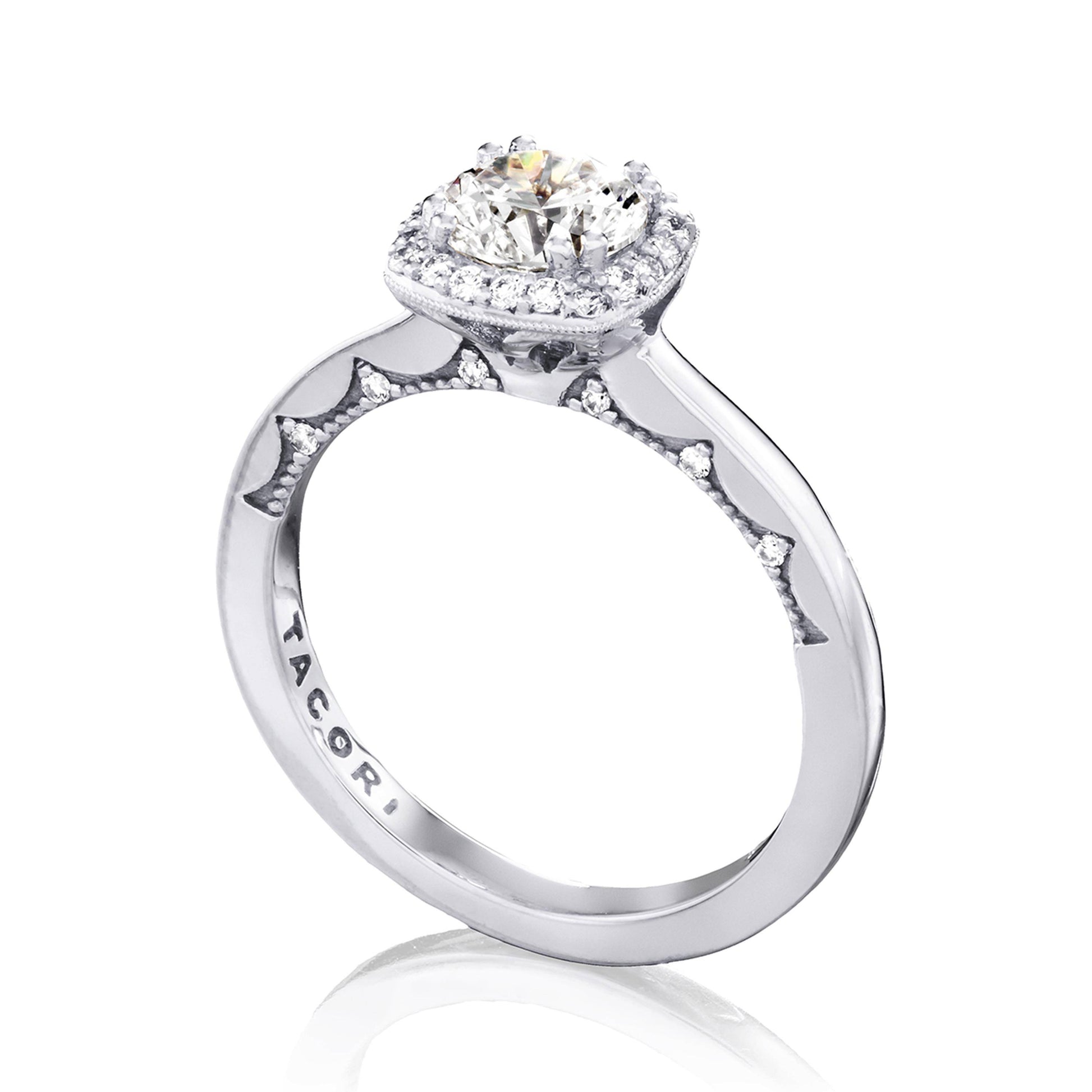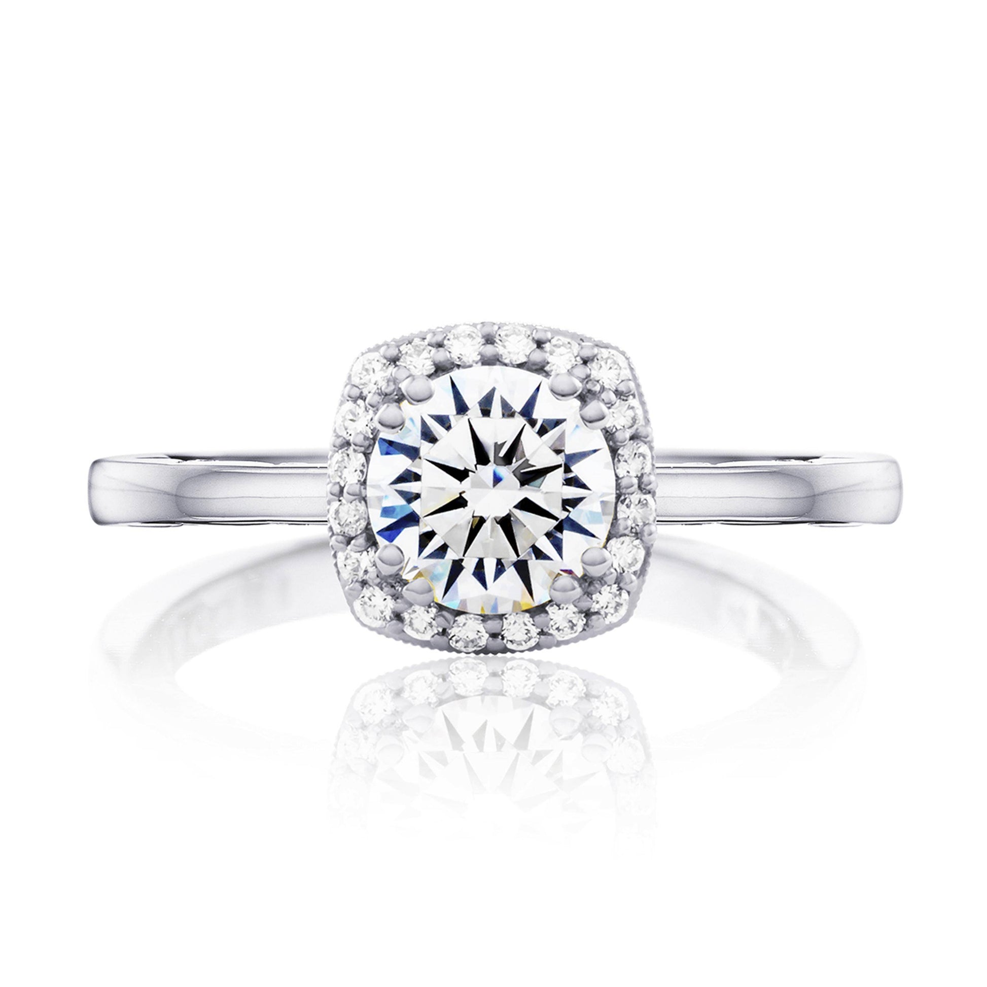 Love in bloom. The beauty in the simplicity of this round brilliant cut diamond engagement ring with a cushion bloom is amplified by the Coastal Crescent inner face, with a diamond-cuddled detailing underneath the crescent.
