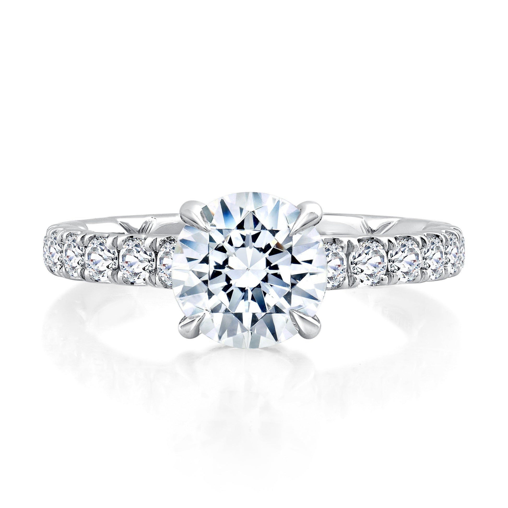 From the A.JAFFE Classics™ Collection, this round cut engagement ring features a hidden halo and shared prong diamond band.The classic style interior features a petite version of the A.JAFFE Quilts™, expertly handcrafted with beauty and luxury in mind.
