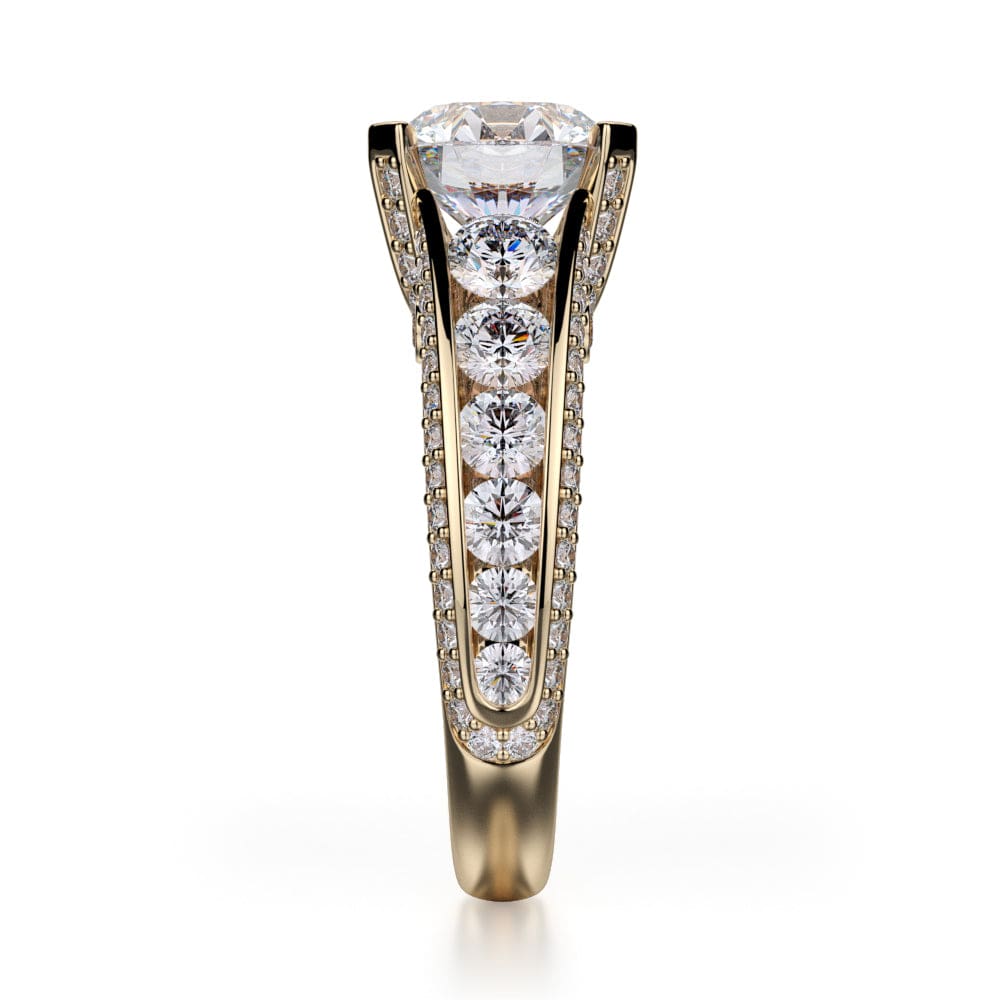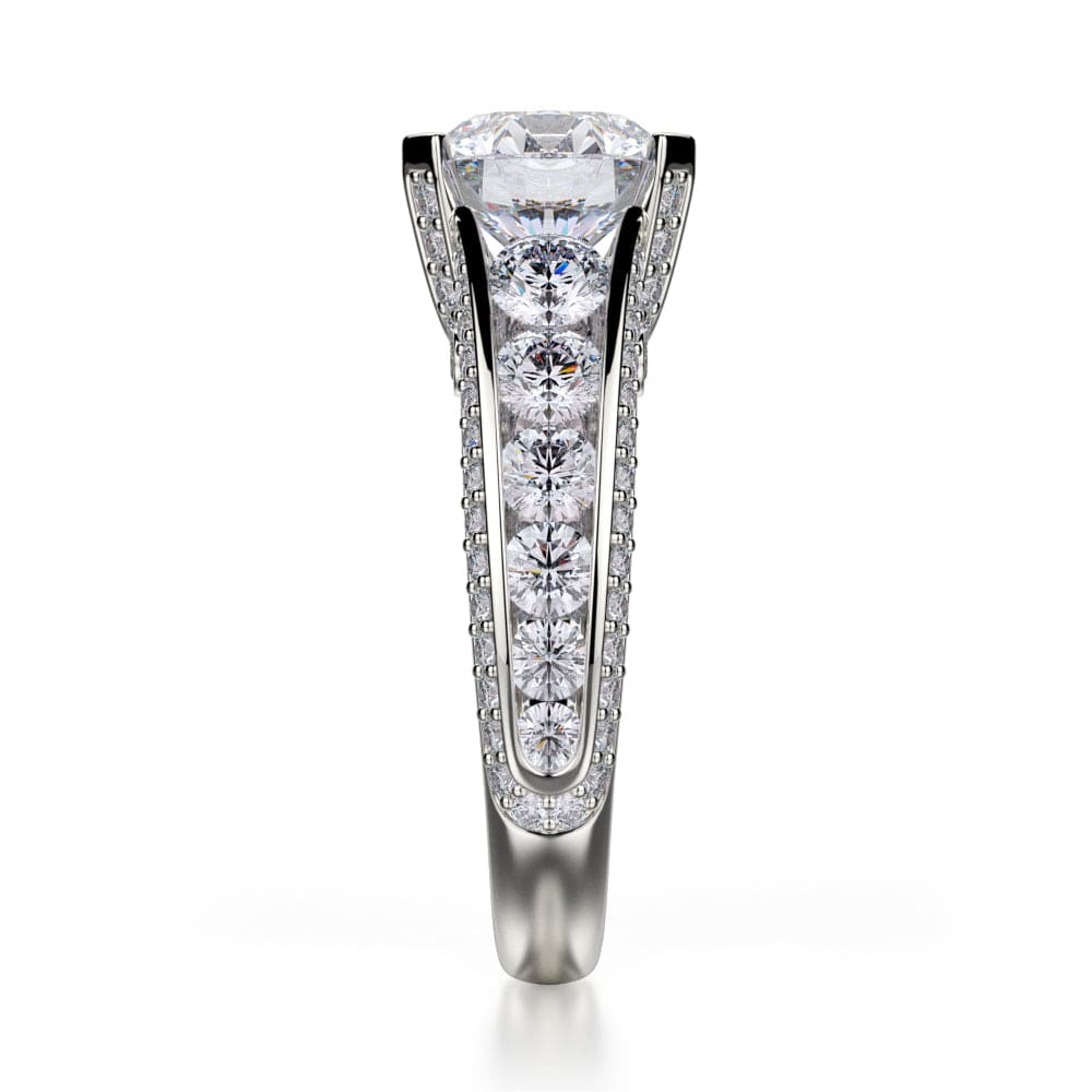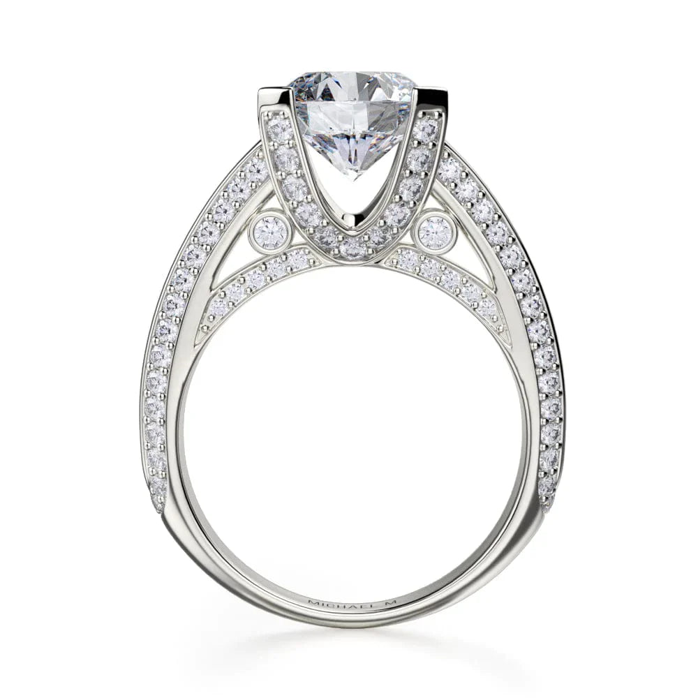 This MICHAEL M engagement ring is adorned with side diamonds handpicked by a certified MICHAEL M gemologist, each side stone has a minimum average color of G, a minimum average clarity of VS, and are hand-placed in an elegant prong setting by one of MICHAEL M’s master artisans.