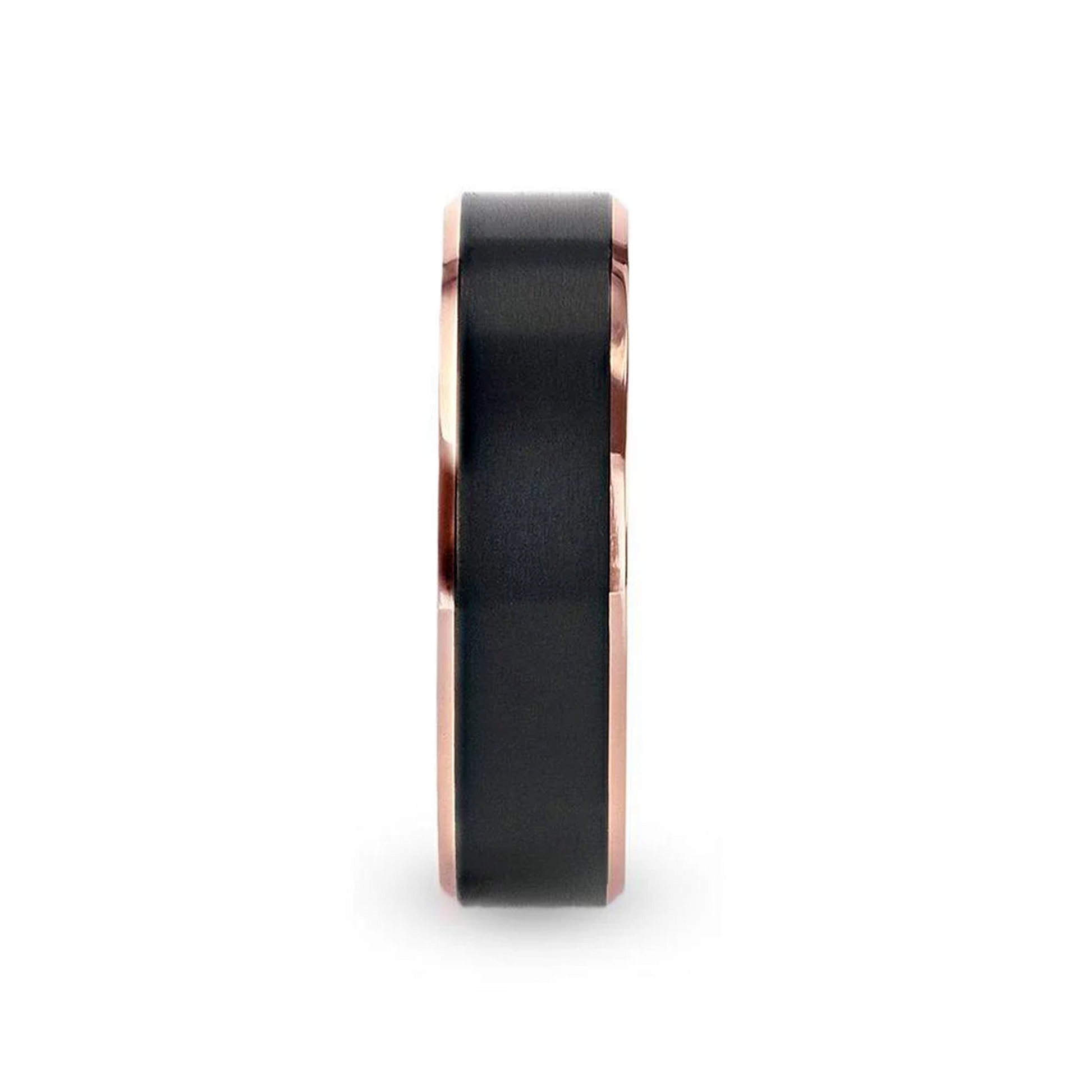 STEPHEN Rose Gold Plated Black Titanium Flat Brushed Center Men's Wedding Ring With Beveled Polished Edges - 6mm & 8mm