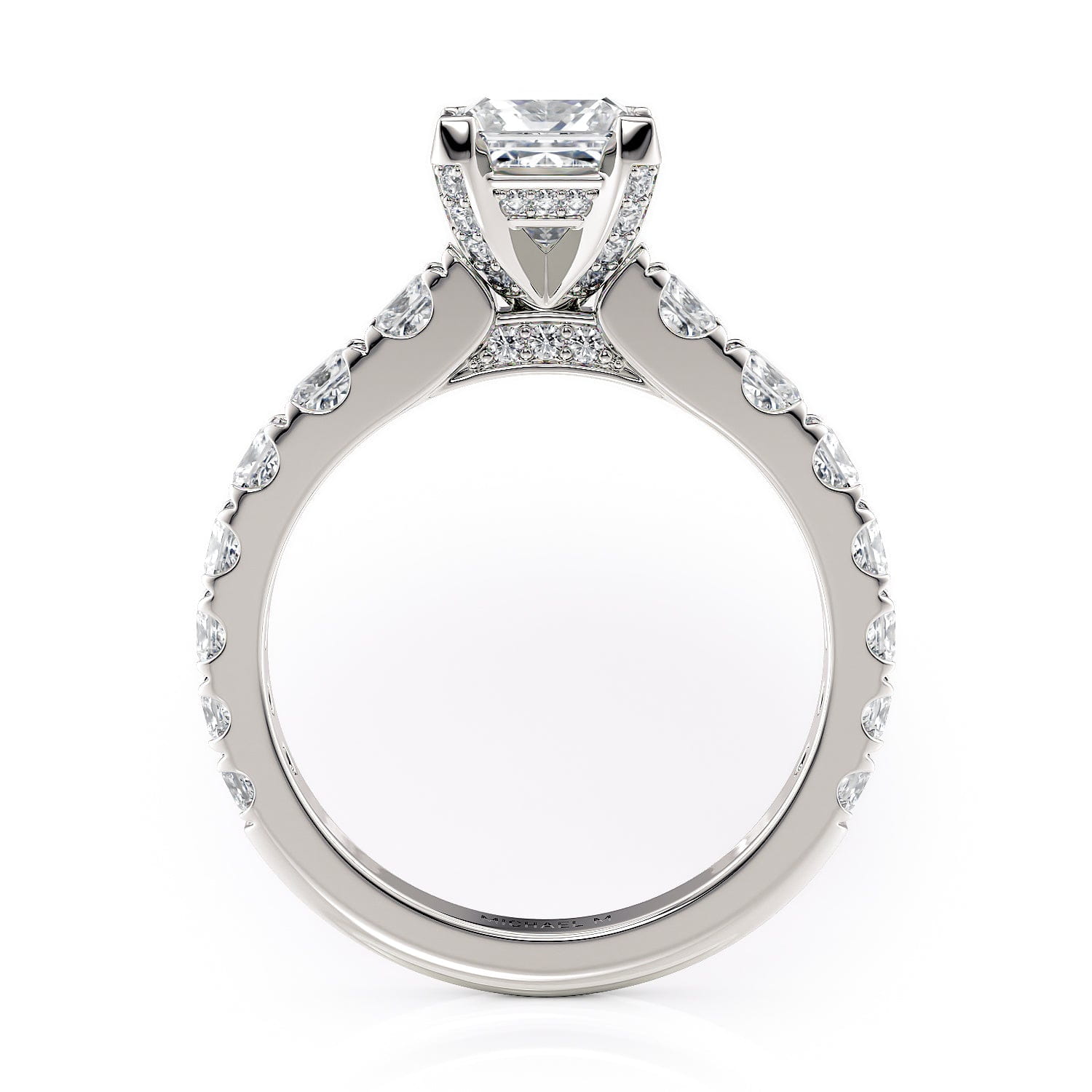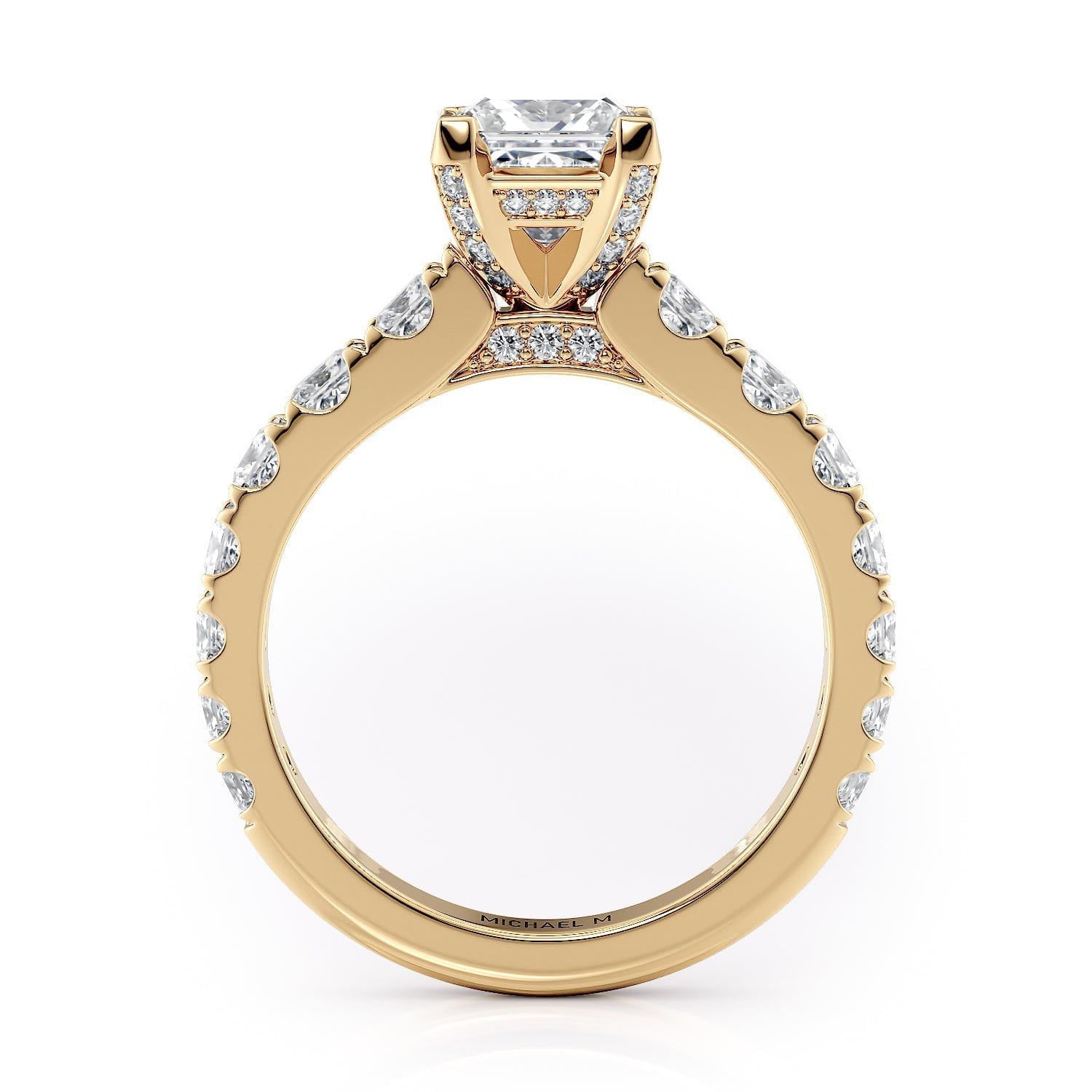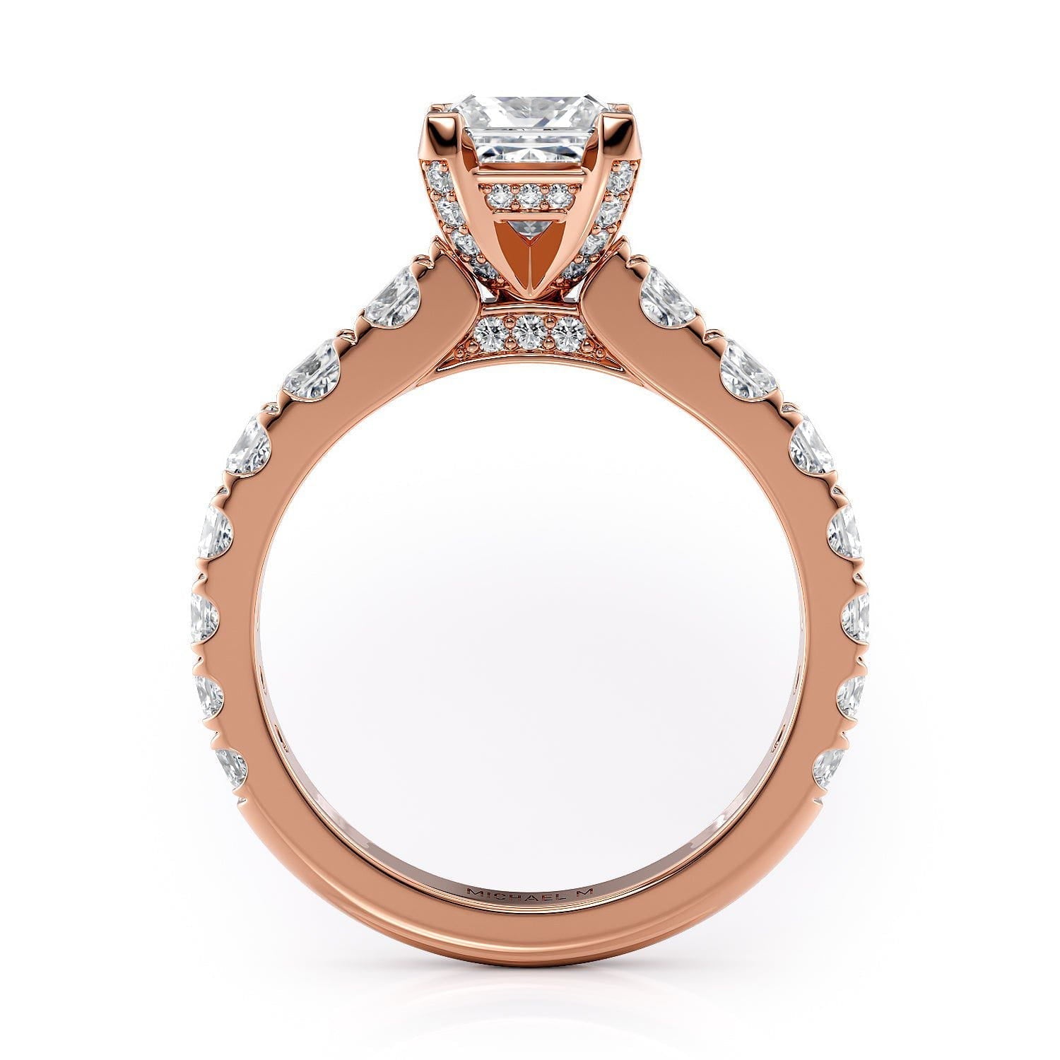 This MICHAEL M engagement ring is adorned with side diamonds handpicked by a certified MICHAEL M gemologist, each side stone has a minimum average color of G, a minimum average clarity of VS, and are hand-placed in an elegant prong setting by one of MICHAEL M’s master artisans.