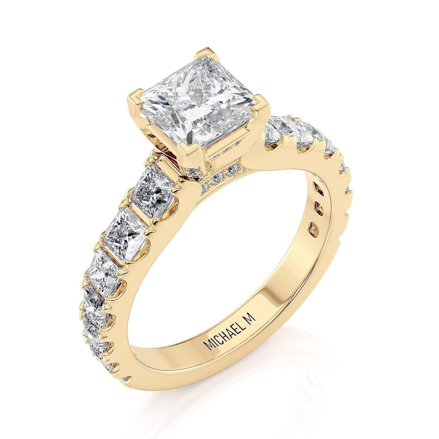 This elegant diamond engagement ring showcases a dazzling princess-cut center stone, enhanced by additional princess-cut diamonds set along the band, embodying classic elegance and refined artistry.
