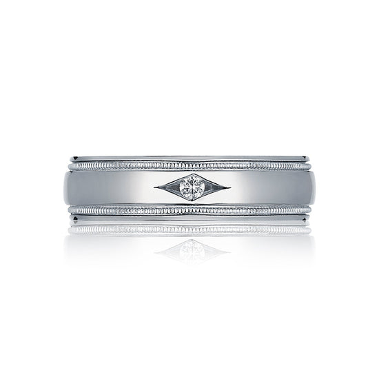 Elegant Tacori men's wedding band with diamond centerpiece, iconic crescent design, and high polished finish. Available in Platinum & 18k White, Yellow, & Rose Gold.