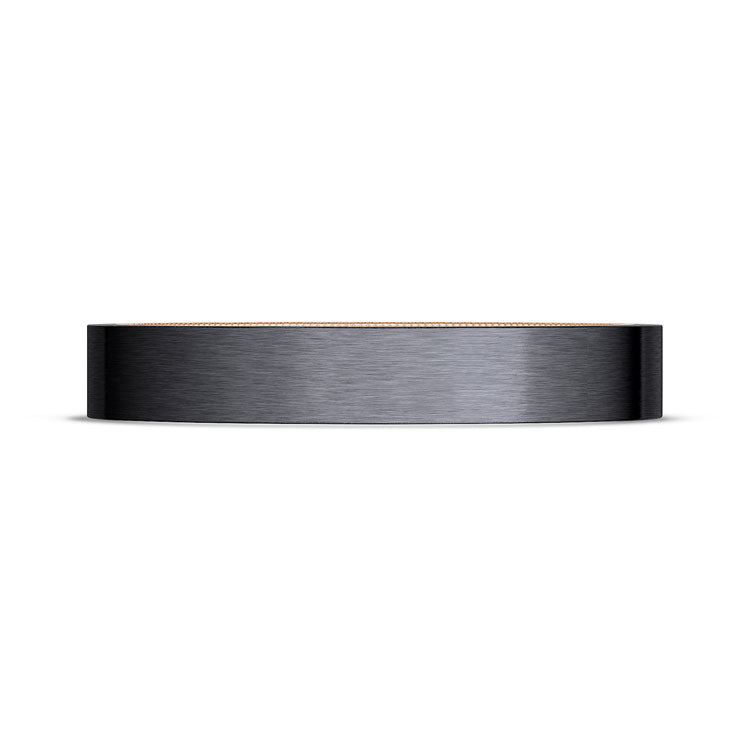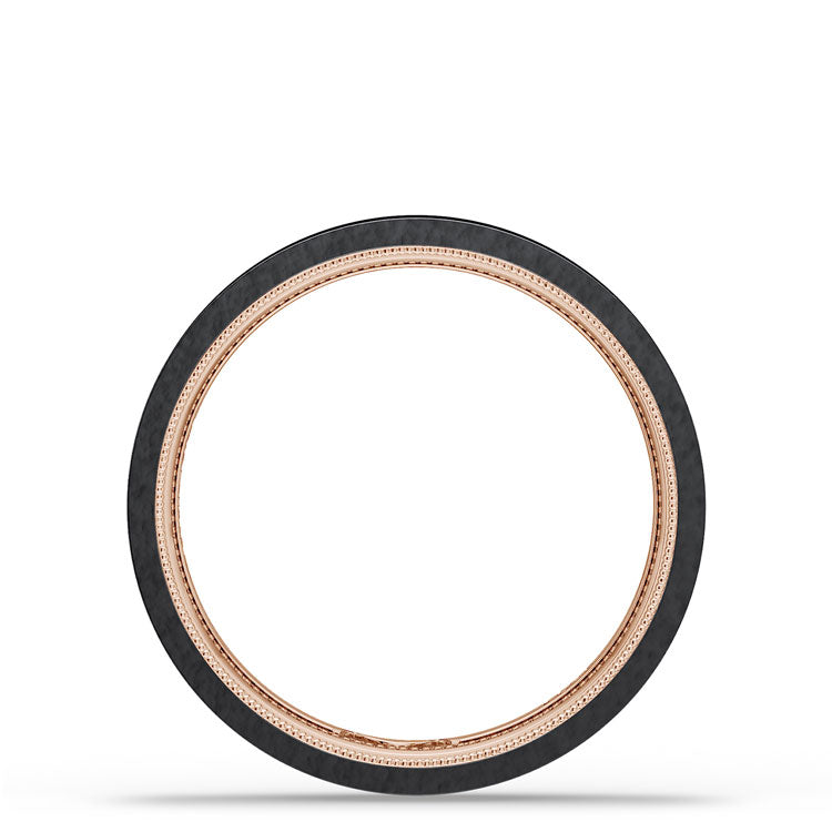 The ceiling and inner face silhouette of two metals, Black Titanium and 18kt Rose Gold, make for an eye-catching tone-on-tone contrast. The inner face is decorated with hand-hewn milgrain, beading, and TACORI Crescent detailing. Rings are available in full and half sizes from 4-10.