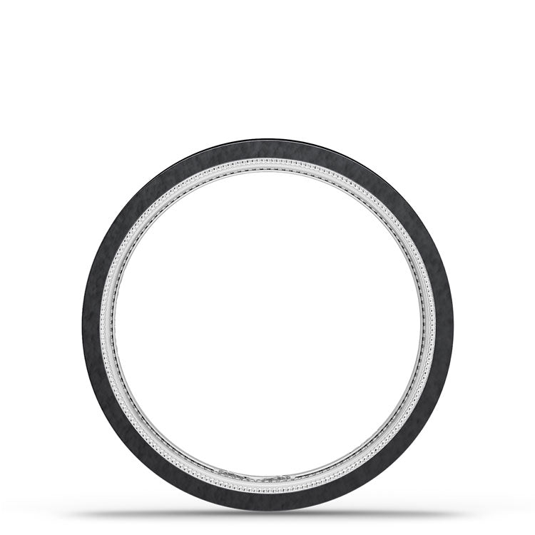 The ceiling and inner face silhouette of two metals, Black Titanium and 18kt White Gold, make for an eye-catching tone-on-tone contrast. The inner face is decorated with hand-hewn milgrain, beading, and TACORI Crescent detailing. Rings are available in full and half sizes from 4-10.