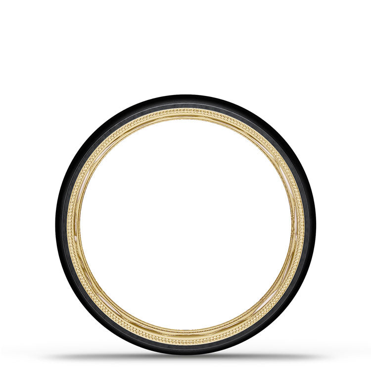 The ceiling and inner face silhouette of two metals, Black Titanium and 18kt Yellow Gold, make for an eye-catching tone-on-tone contrast. The inner face is decorated with hand-hewn milgrain, beading, and TACORI Crescent detailing. Rings are available in full and half sizes 6-12.