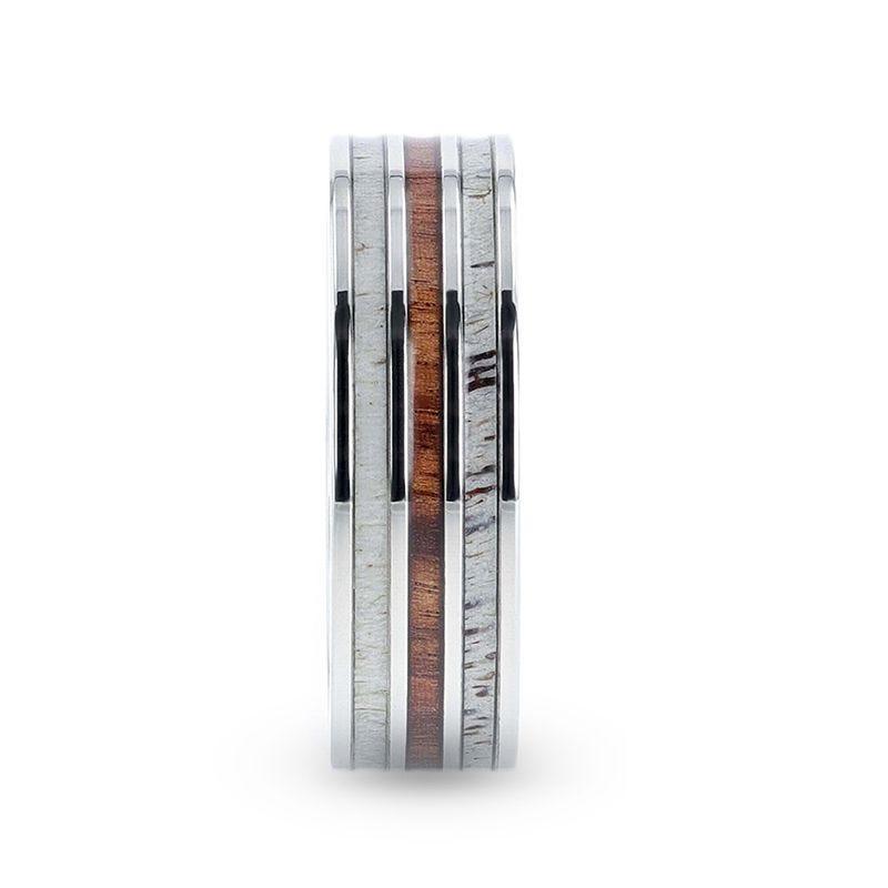 TRIPOLI Wood Inlaid Titanium Flat Polished Finish Men's Wedding Ring with White Double Deer Antler Edges - 8mm