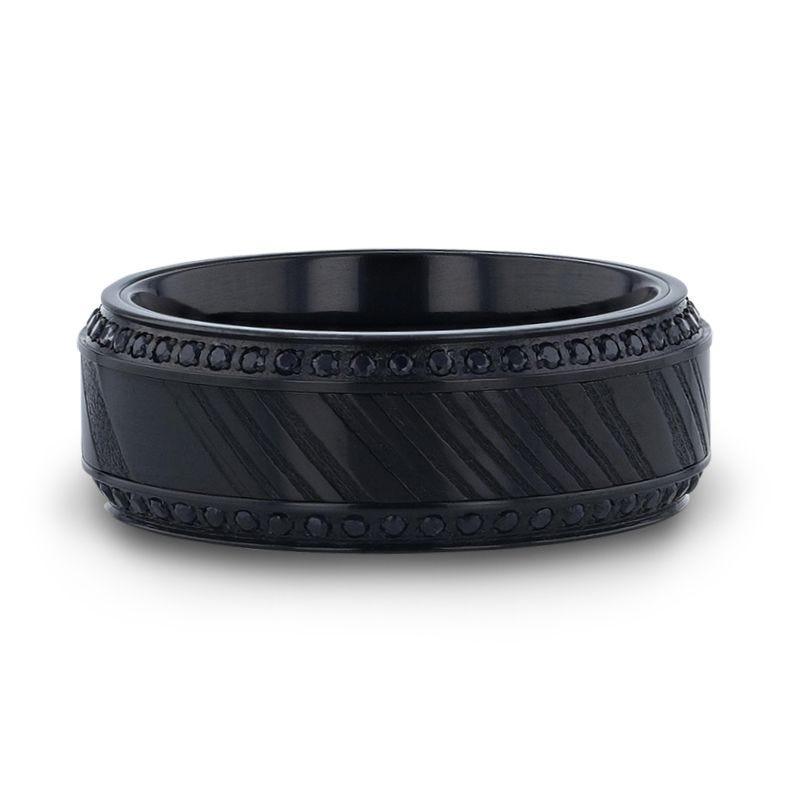 - Black titanium ring with black Damascus steel inlay and black sapphires around the edges.