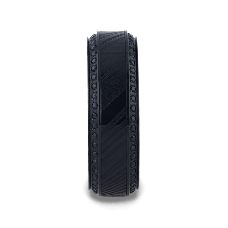 Concealed in shadow. This bad boy has a black Damascus steel inlay, and it's a real TROPHY. Around the edges are black sapphires, each set within a beveled channel. The edges are clean and precise, altogether providing a royal and unique look. It comes in an 8mm width and several sizes.
