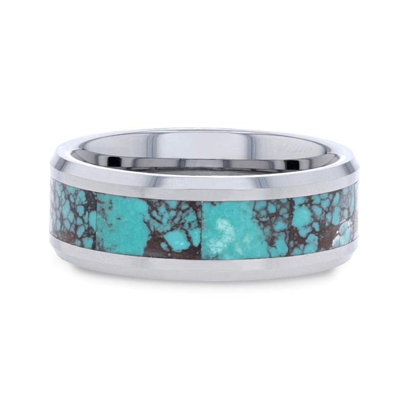 TURKIS Turquoise Spider Web Inlay Tungsten Carbide ring with Beveled Polished Edges - 8mm