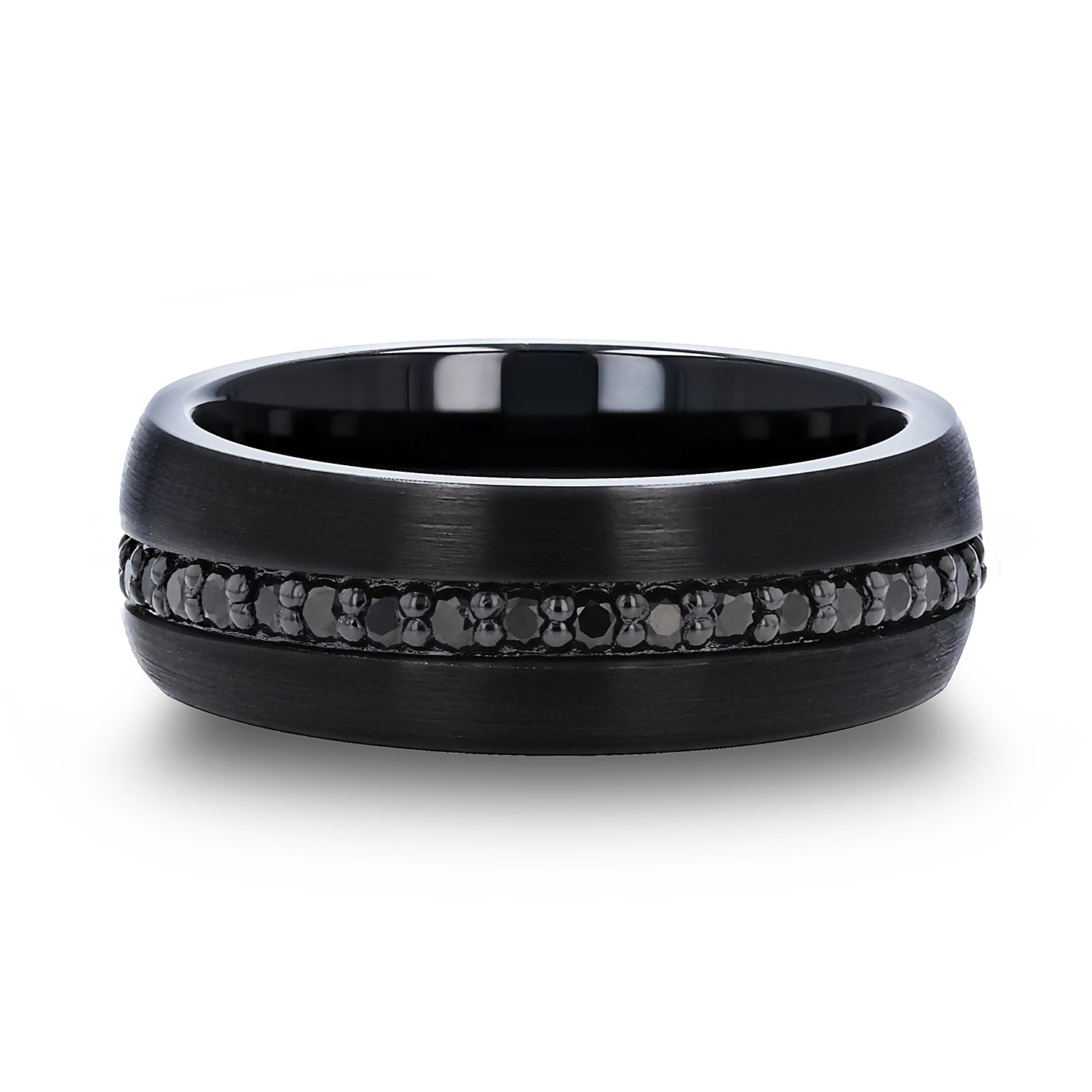 The VALIANT Men's Black Sapphire Tungsten Ring shows him he's your hero. Round cut black sapphires glisten along the center groove of this elegant men's wedding band of brushed black tungsten carbide. A tungsten sapphire ring is a treasure of commitment forever. Choose VALIANT black tungsten ring with black sapphires 8mm size for Thorsten's lifetime warranty and the lifelong beauty of the toughest material on earth.