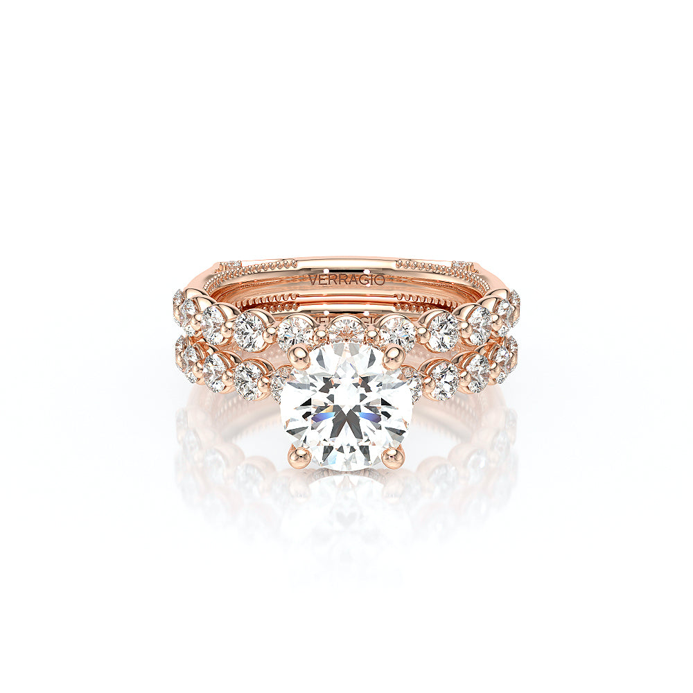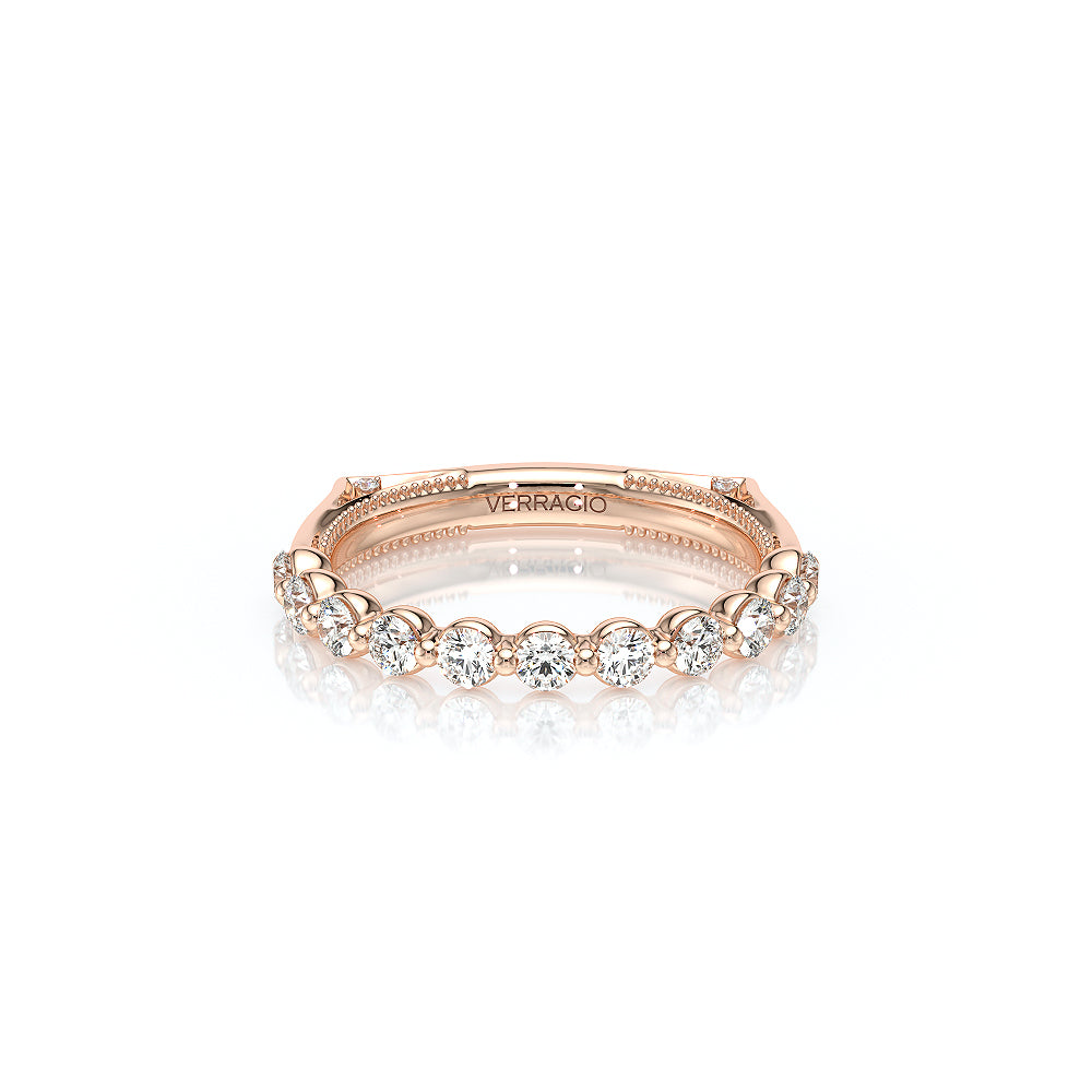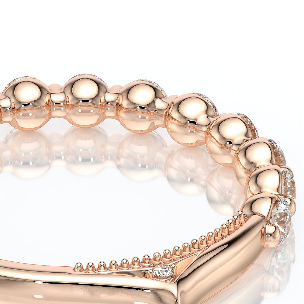 The VNG-2201W-2.4 wedding band features a euro-style shank elevated by two tiny diamond bezels. 2.4mm stones gracefully line the shank, set with a single shared prong, offering a seamless and elegant complement to its engagement ring counterpart.