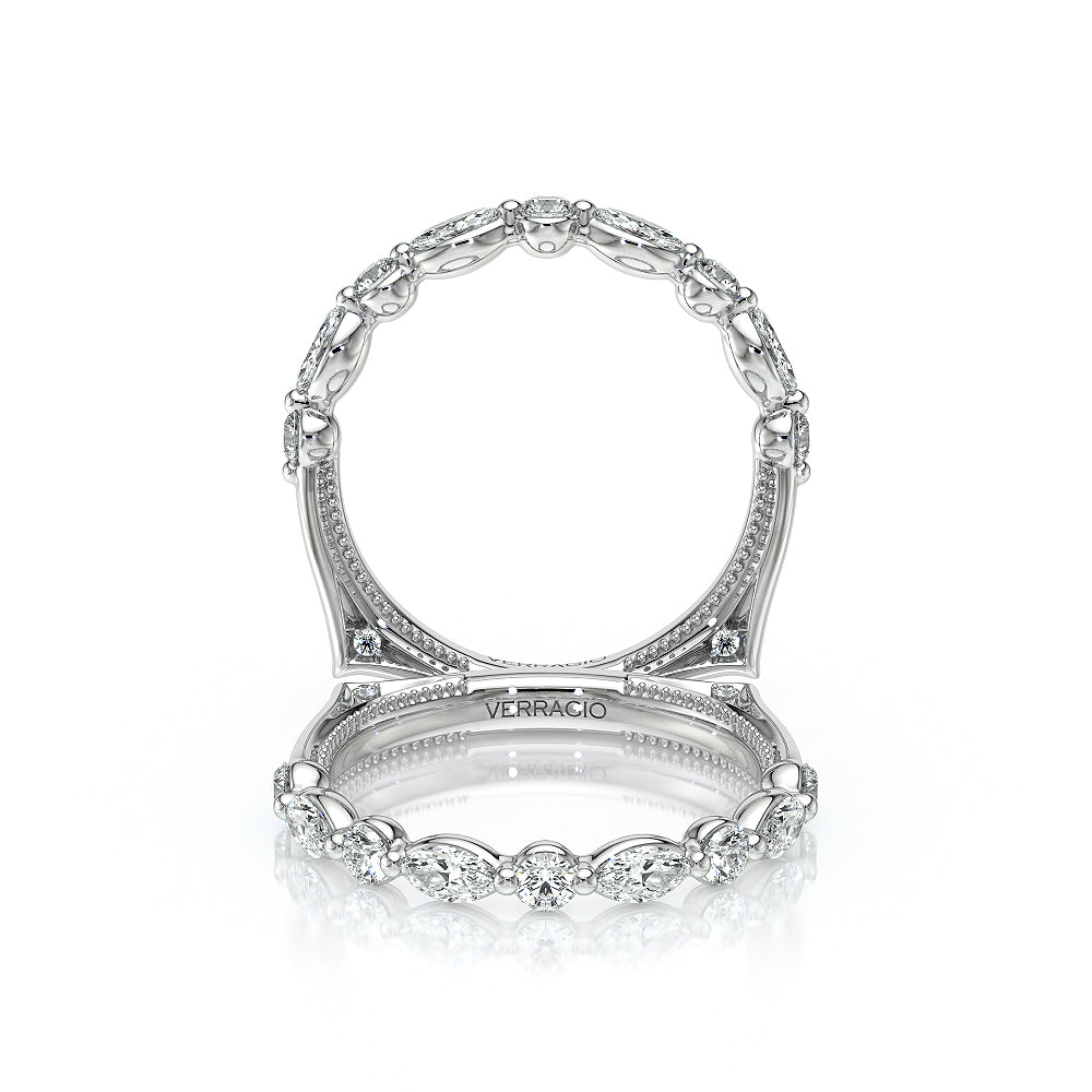 The VNG-2202W-2.5 wedding band features a euro-style shank with alternating round and marquise stones, accented by two set bezels that symbolize unity, creating a timeless and harmonious design.