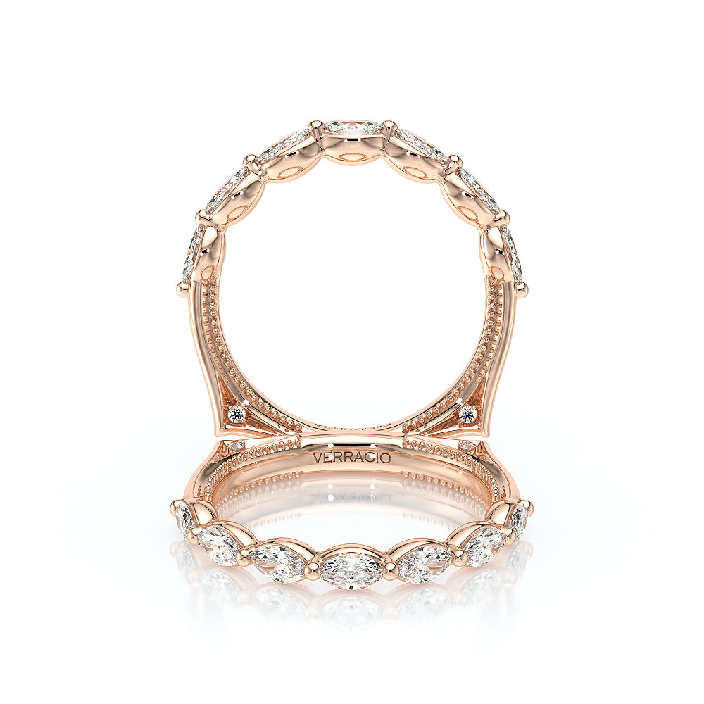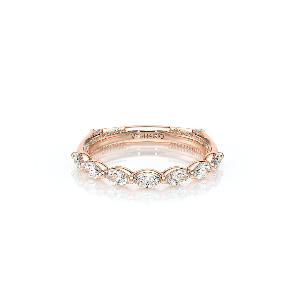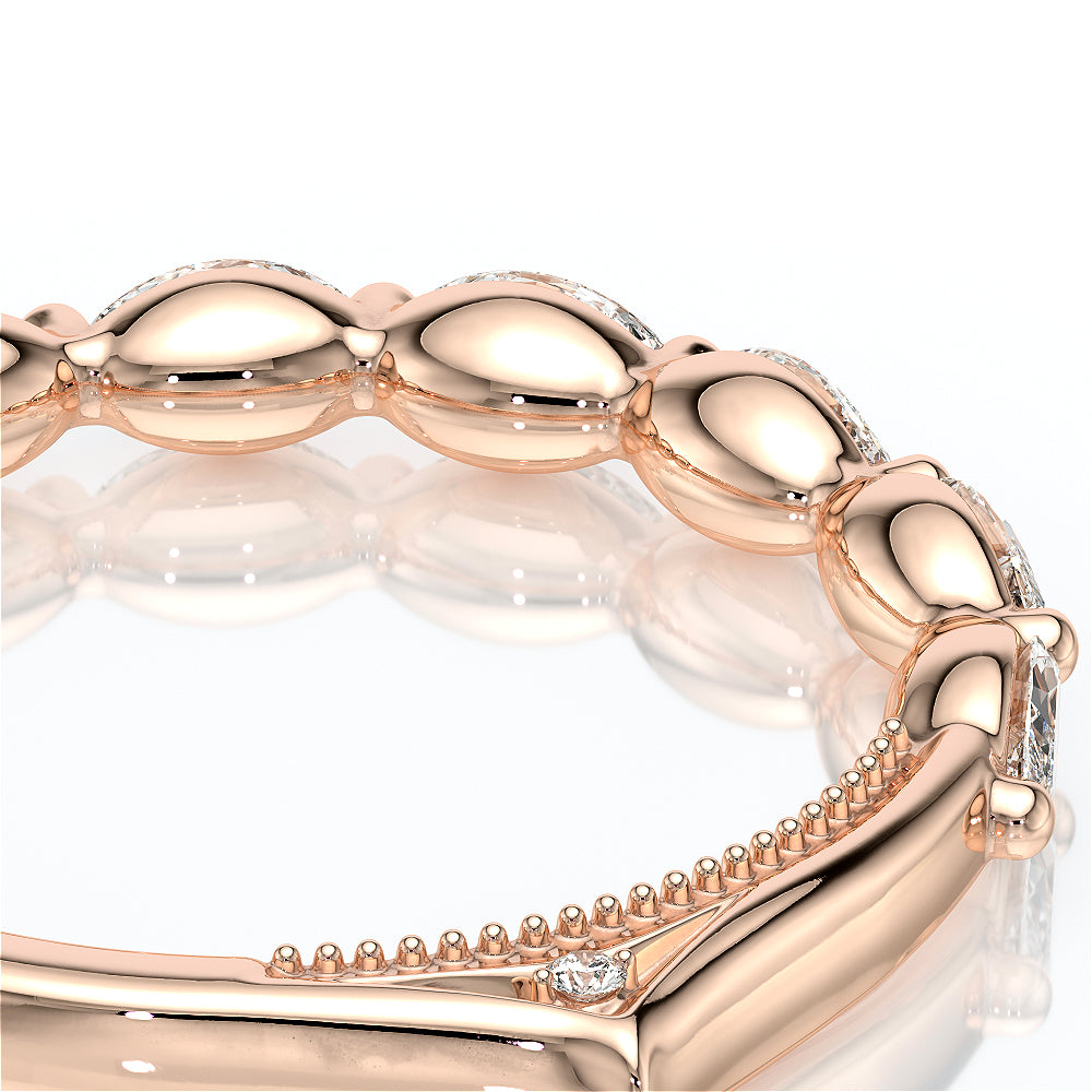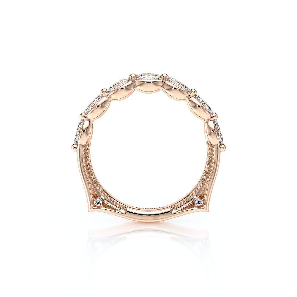 The VNG-2205W band showcases seven bold south-to-west facing marquise stones, beautifully complemented by two bezel-set stones at the bottom that symbolize unity, along with Verragio's signature beading for a harmonious and timeless design