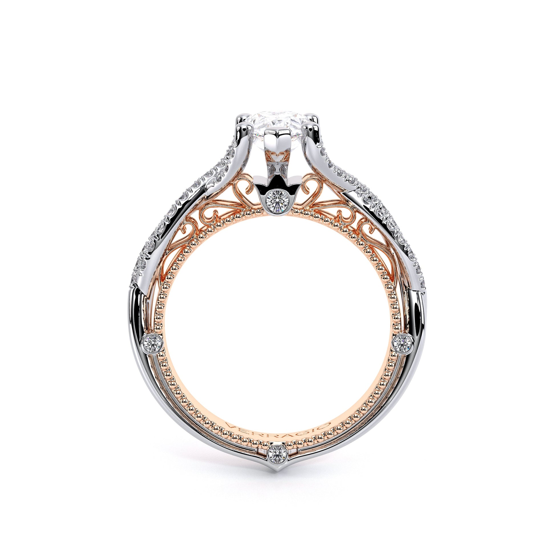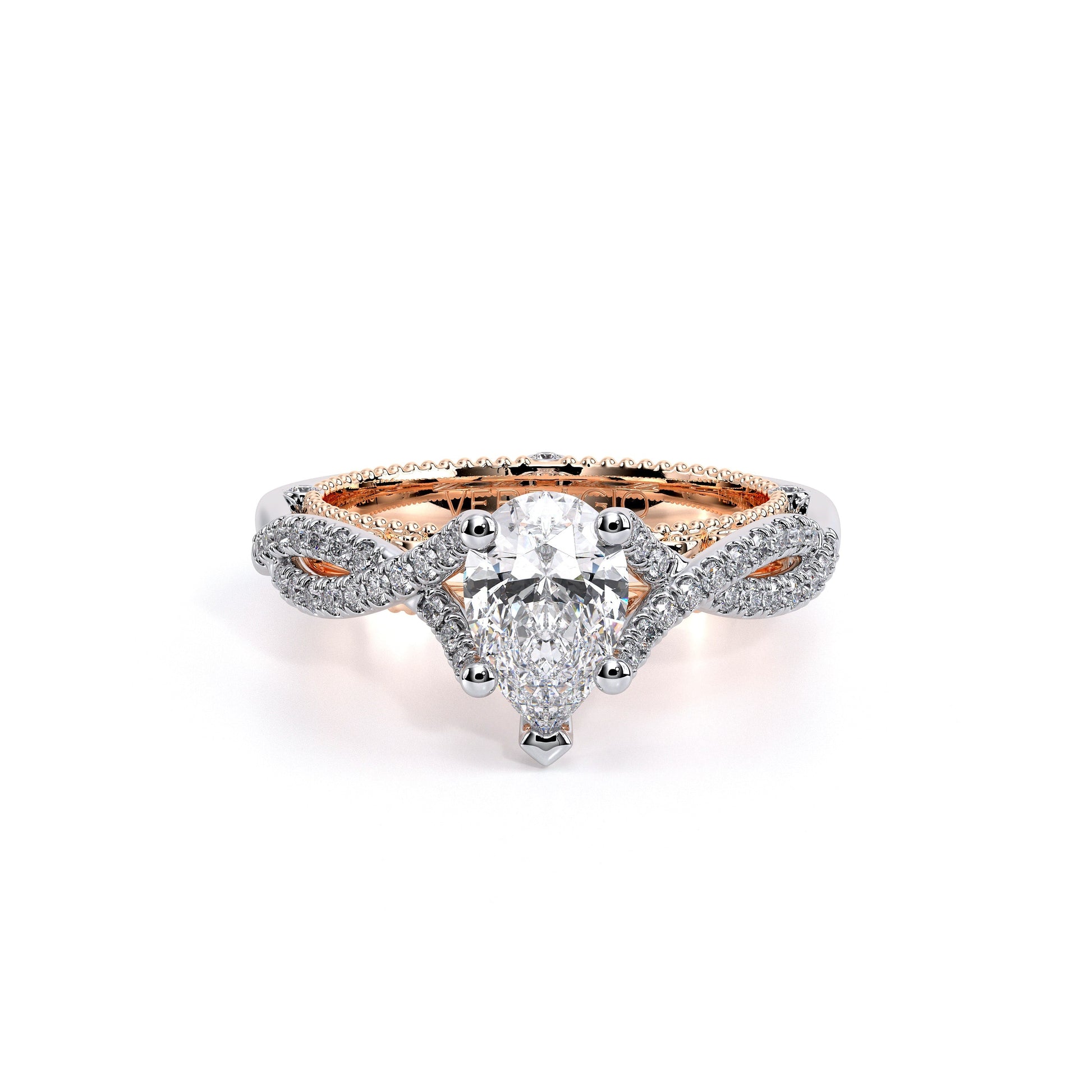 VENETIAN-5003 engagement ring from the Venetian Collection, features round brilliant-cut diamonds pave set in a twisted shank, enhancing any center shape of your choice in a floating design. Our beautiful Venetian lace and Verragio signature beading completes this vintage piece.