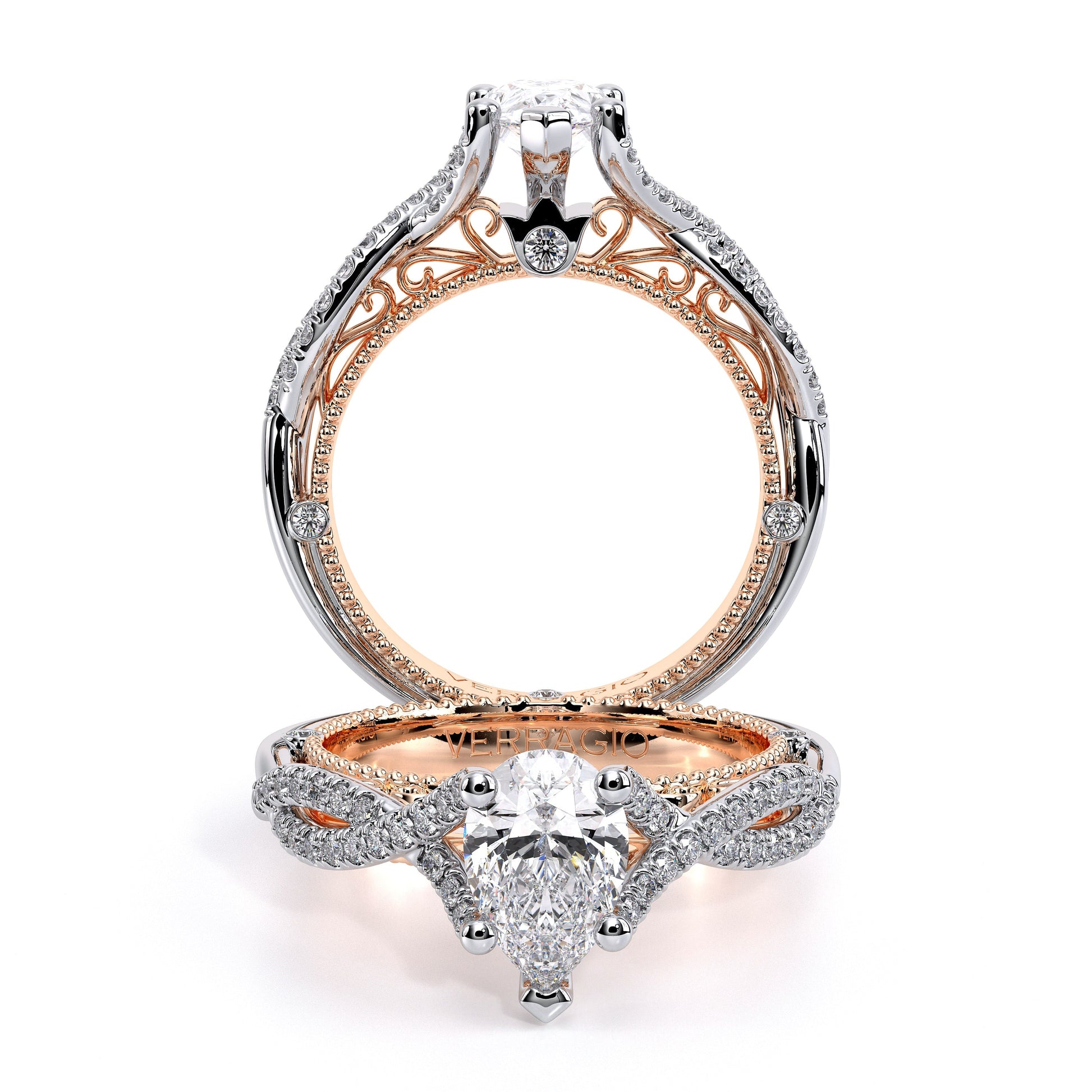VENETIAN-5003 engagement ring from the Venetian Collection, features round brilliant-cut diamonds pave set in a twisted shank, enhancing any center shape of your choice in a floating design. Our beautiful Venetian lace and Verragio signature beading completes this vintage piece.