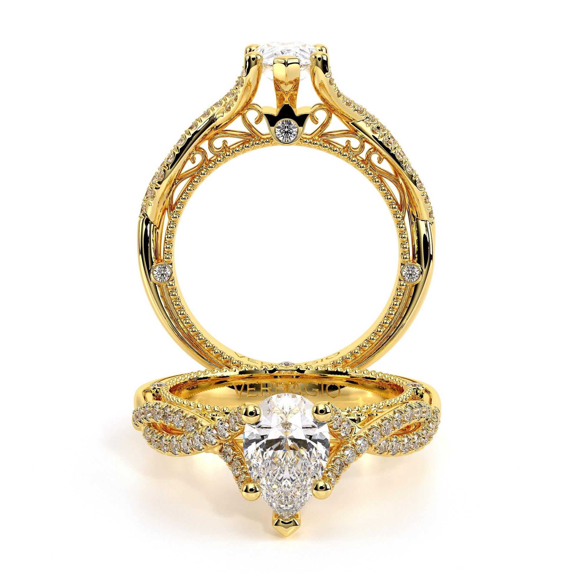VENETIAN-5003 engagement ring from the Venetian Collection, features round brilliant-cut diamonds pave set in a twisted shank, enhancing any center shape of your choice in a floating design. Our beautiful Venetian lace and Verragio signature beading completes this vintage piece.