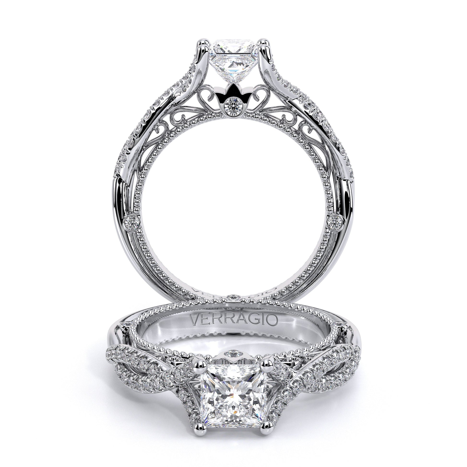 VENETIAN-5003 engagement ring from the Venetian Collection, features a pave' set diamond twisted shank showcasing handcrafted lace and Verragio signature beading. This beautiful vintage four-prong setting gives an illusion of a floating center stone and can accommodate almost any diamond cut desired.