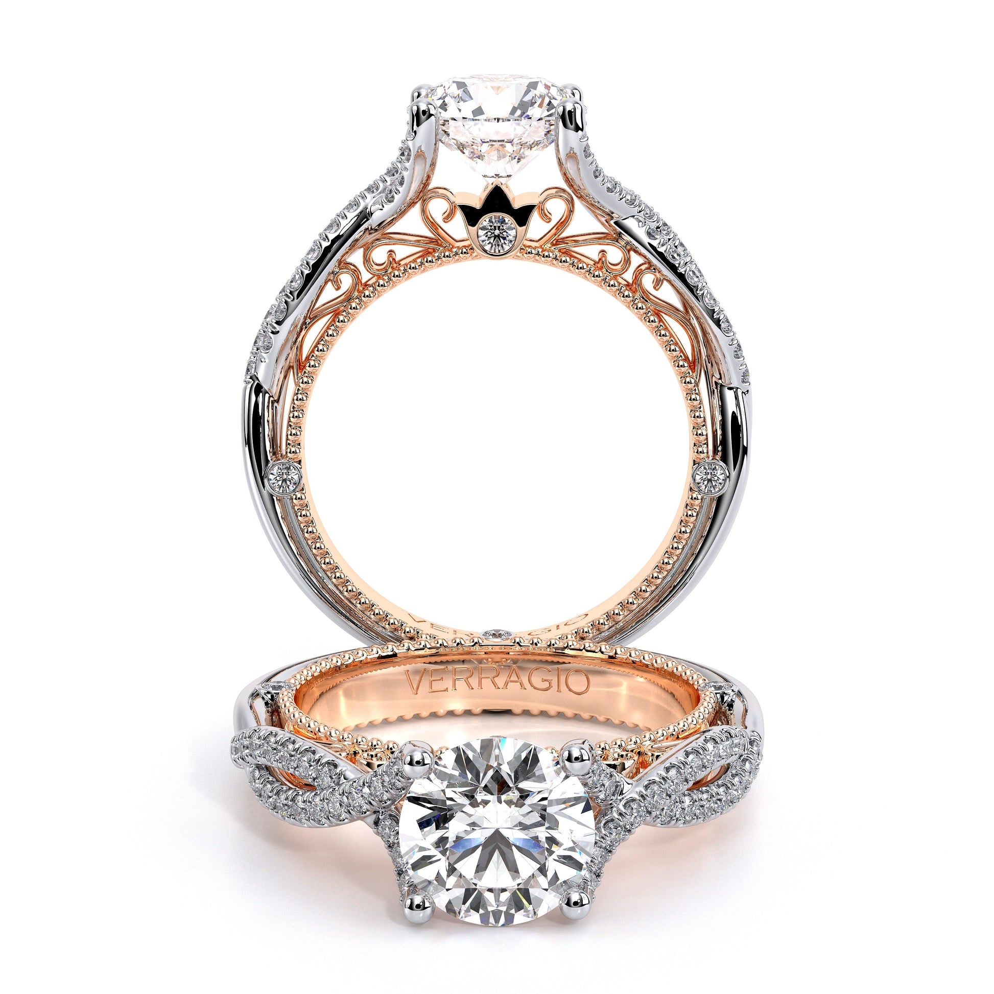 VENETIAN-5003 engagement ring from the Venetian Collection, features round brilliant-cut diamonds pave set in a twisted shank, enhancing the center stone giving an illusion of a floating diamond. Our beautiful Venetian lace and Verragio signature beading completes this vintage piece.