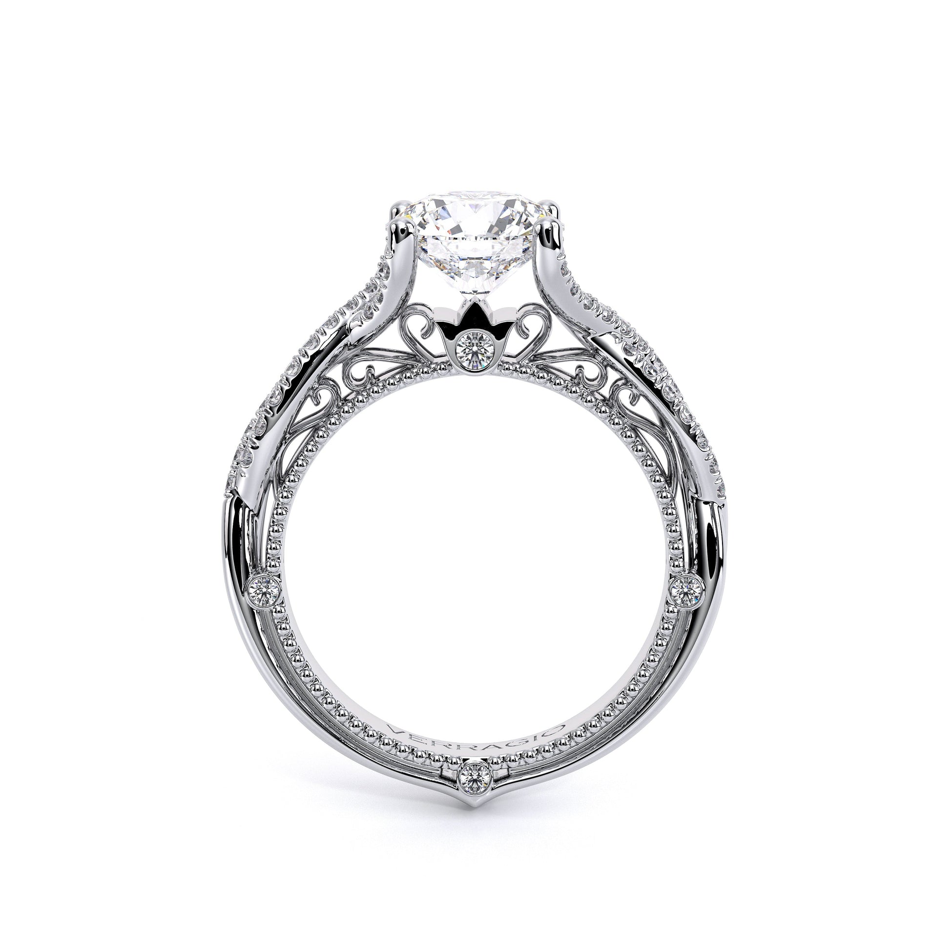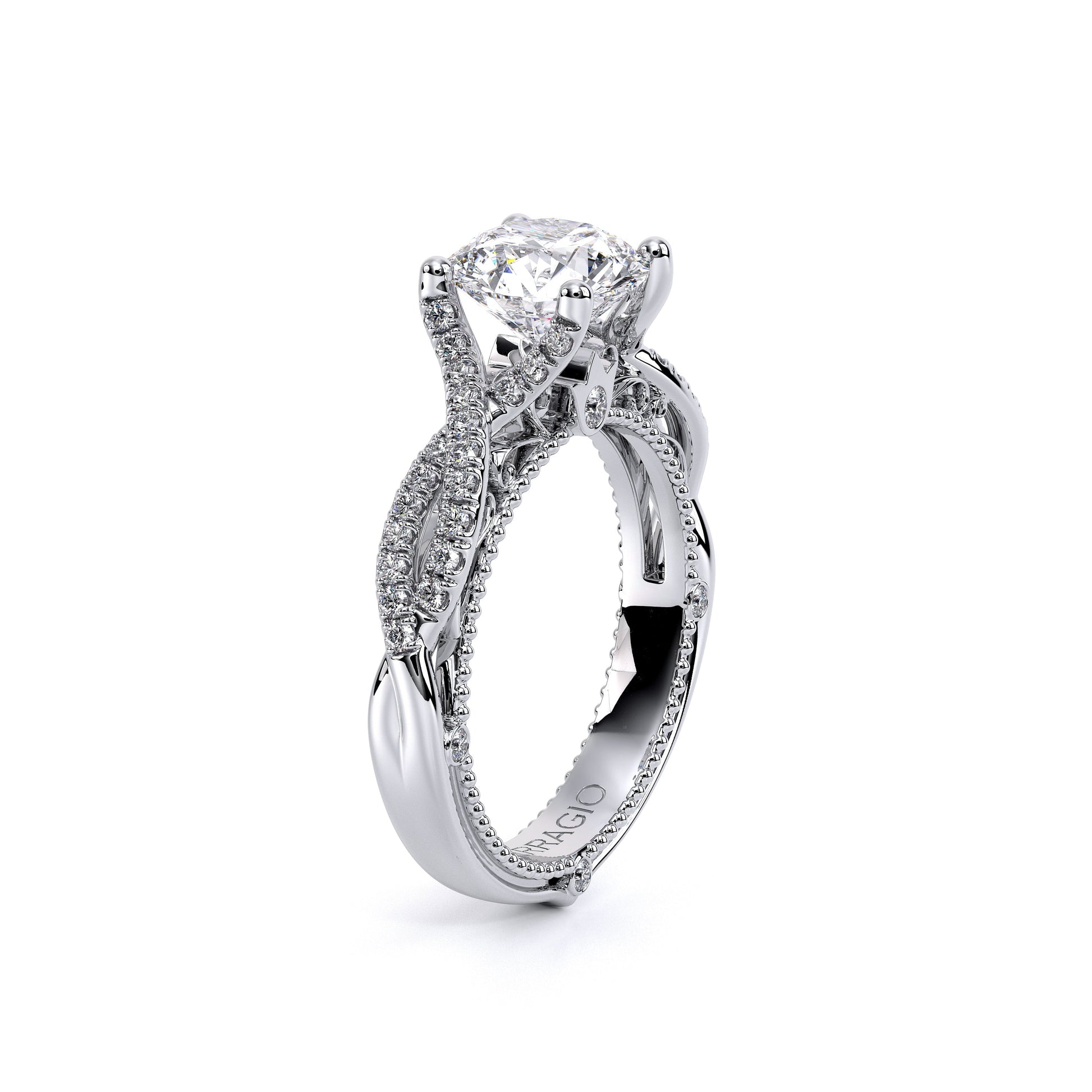 VENETIAN-5003 engagement ring from the Venetian Collection, features round brilliant-cut diamonds pave set in a twisted shank, enhancing the center stone giving an illusion of a floating diamond. Our beautiful Venetian lace and Verragio signature beading completes this vintage piece.