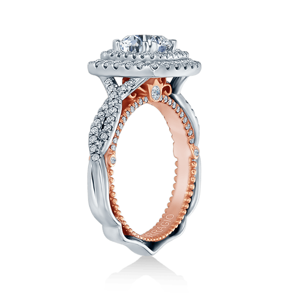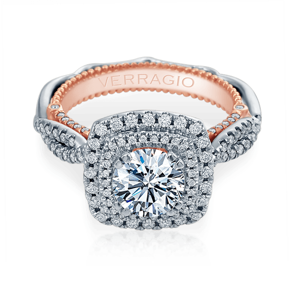 Elevate your love story with the Verragio Women's Engagement Ring from the Venetian Collection. Exuding elegance with a ring of diamonds set into rose gold, this timeless piece features two stunning cushion shaped diamond halos.