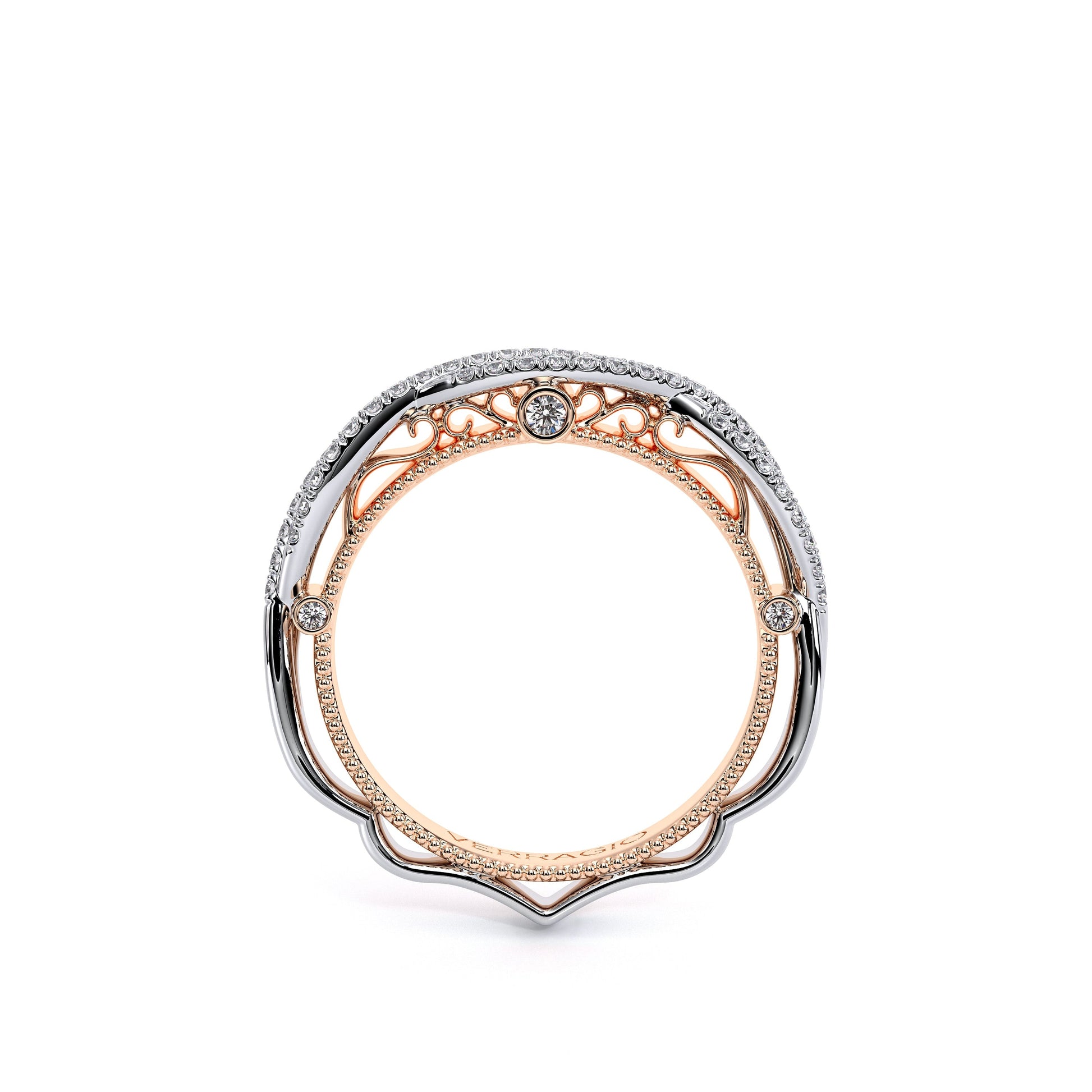VENETIAN-5078W from the Venetian Collection features an intricately designed twisted wedding band with round brilliant diamonds. The inside profile is flawlessly laced with three bezel set round diamonds and our signature beading. You can opt for a twisted or straight wedding band to compliment your Verragio engagement ring.