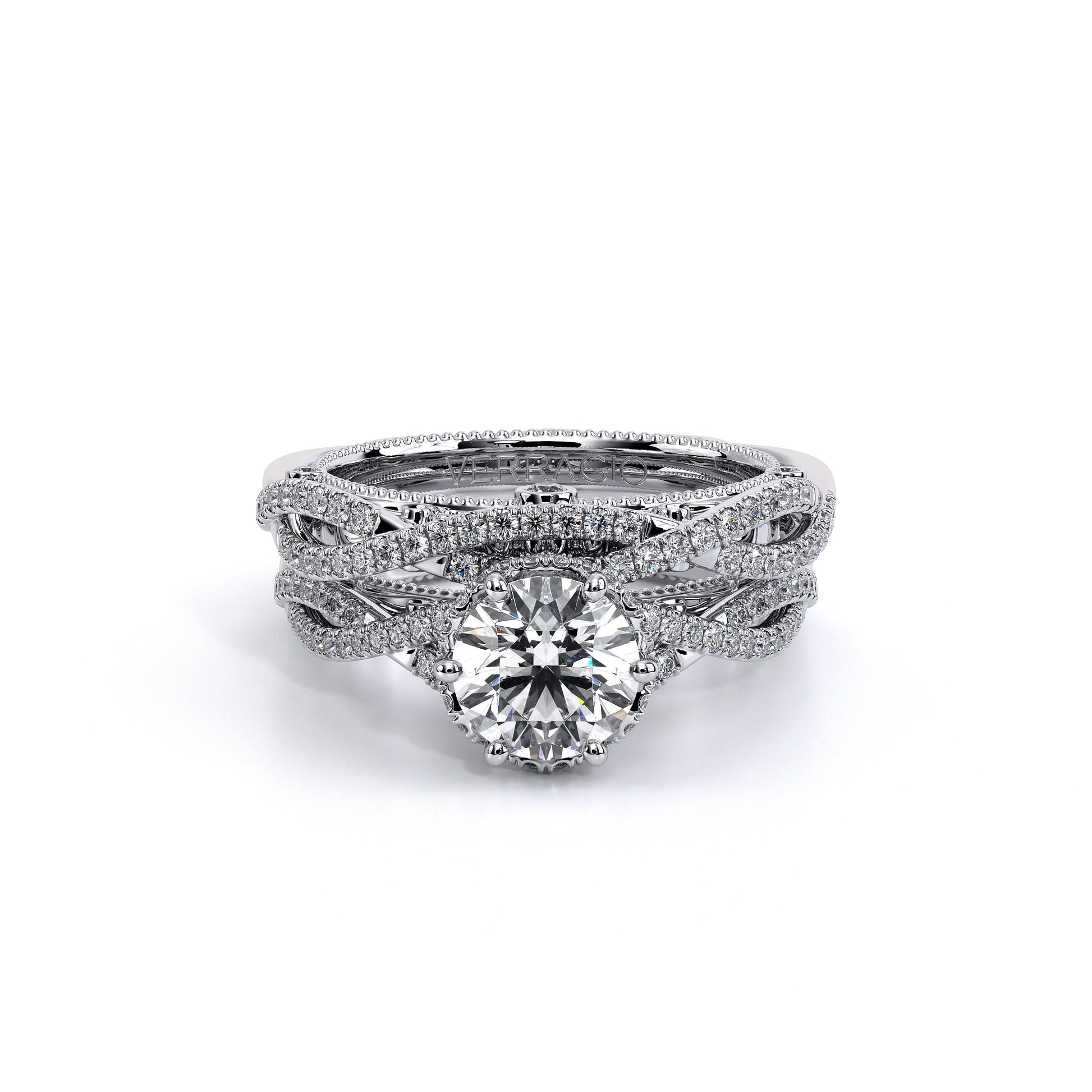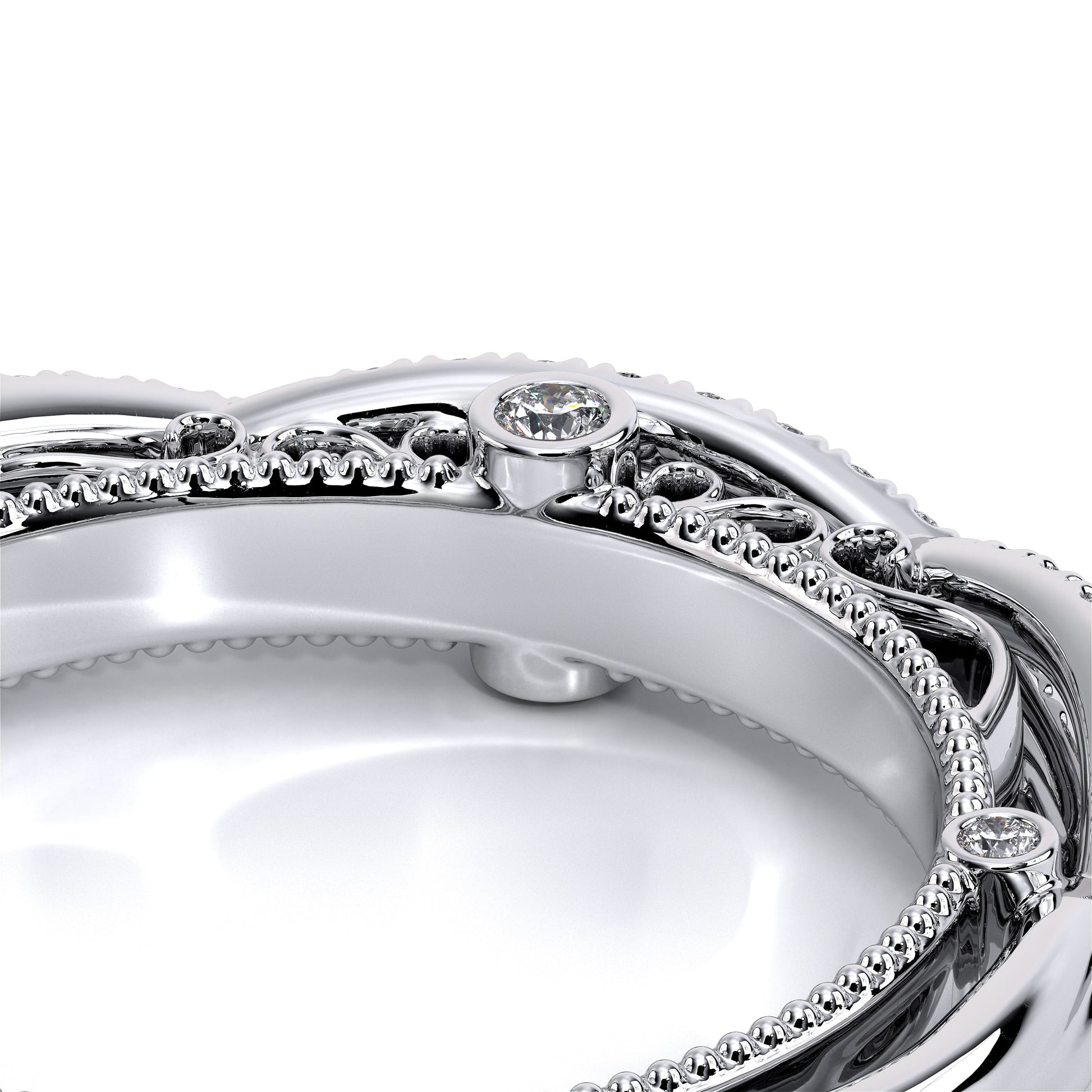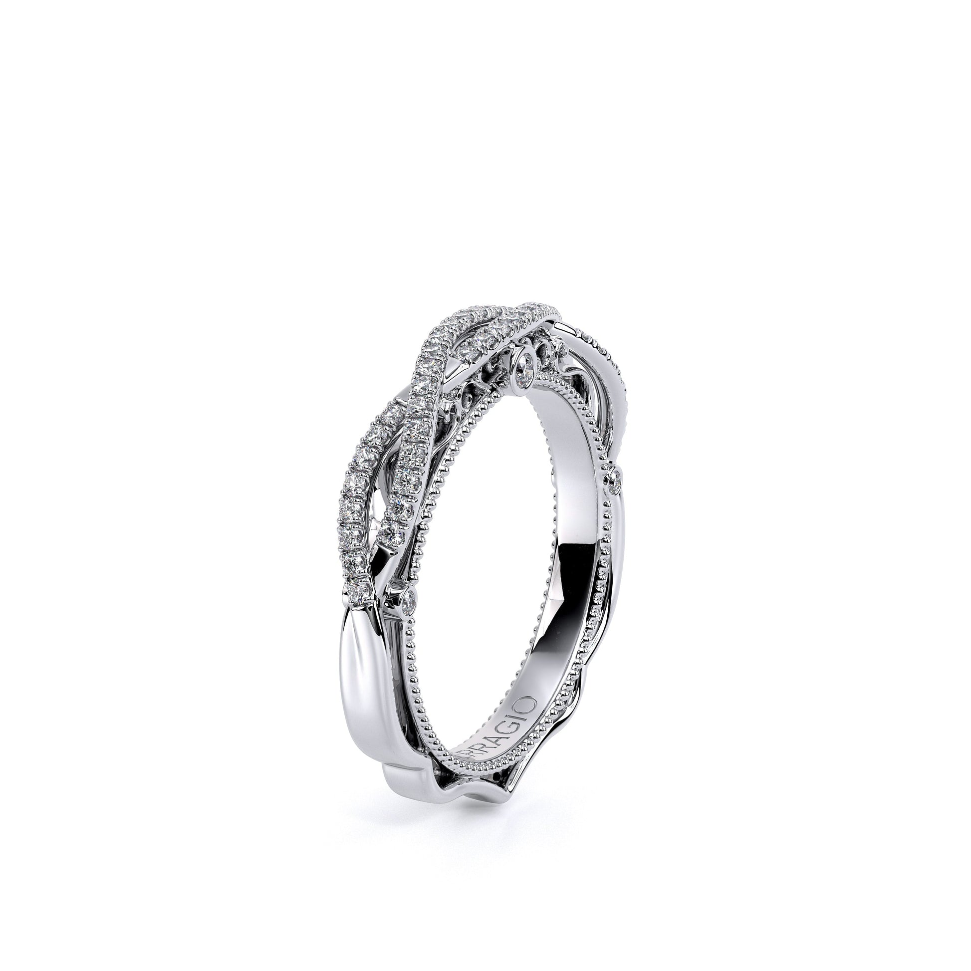 VENETIAN-5078W from the Venetian Collection features an intricately designed twisted wedding band with round brilliant diamonds. The inside profile is flawlessly laced with three bezel set round diamonds and our signature beading. You can opt for a twisted or straight wedding band to compliment your Verragio engagement ring.