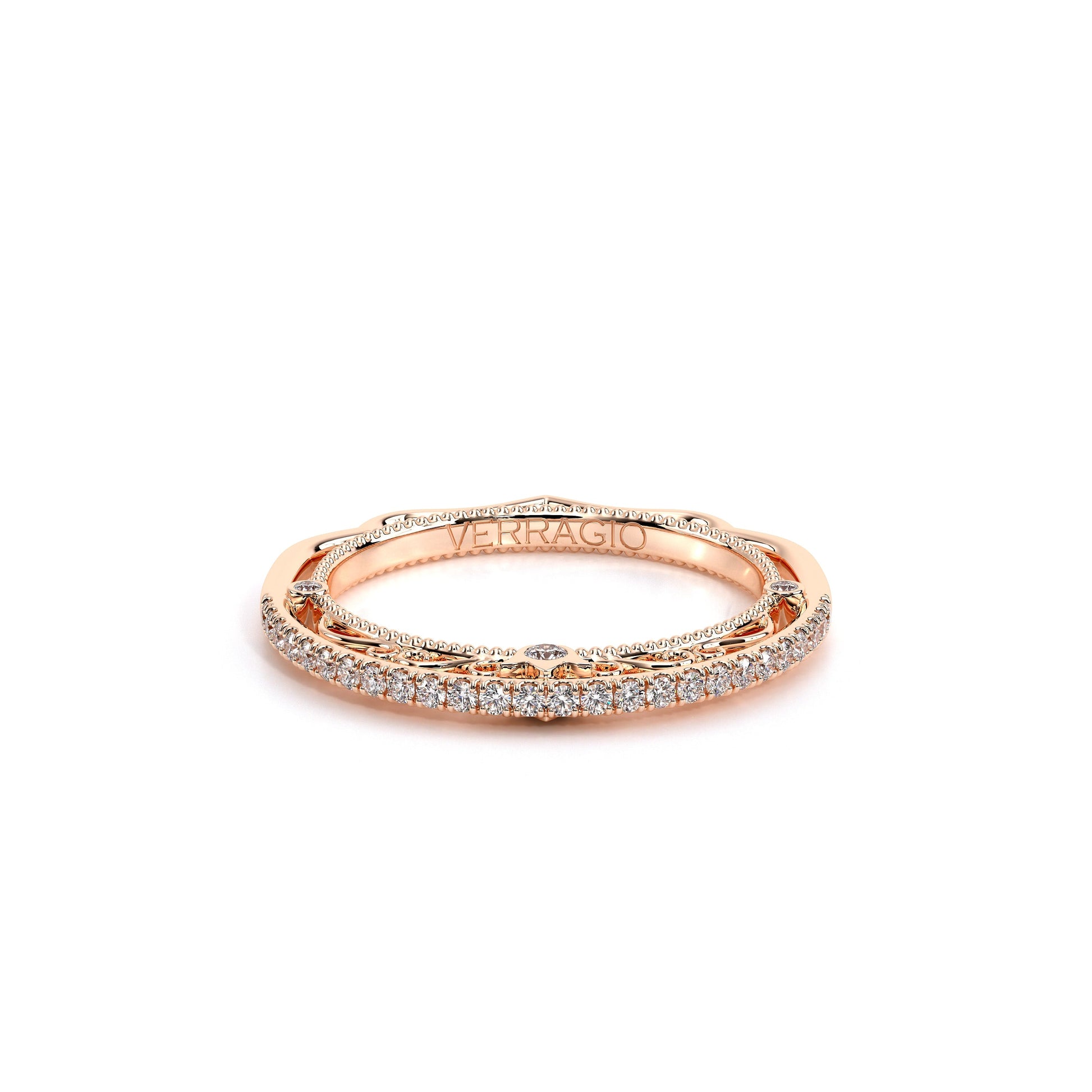 VENETIAN-5078WSB from the Venetian Collection, features an intricate straight wedding band with round brilliant diamonds. The inside profile is beautifully laced with three bezel set round diamonds and our signature beading. You can opt for a straight or twisted wedding band to compliment your Verragio engagement ring.