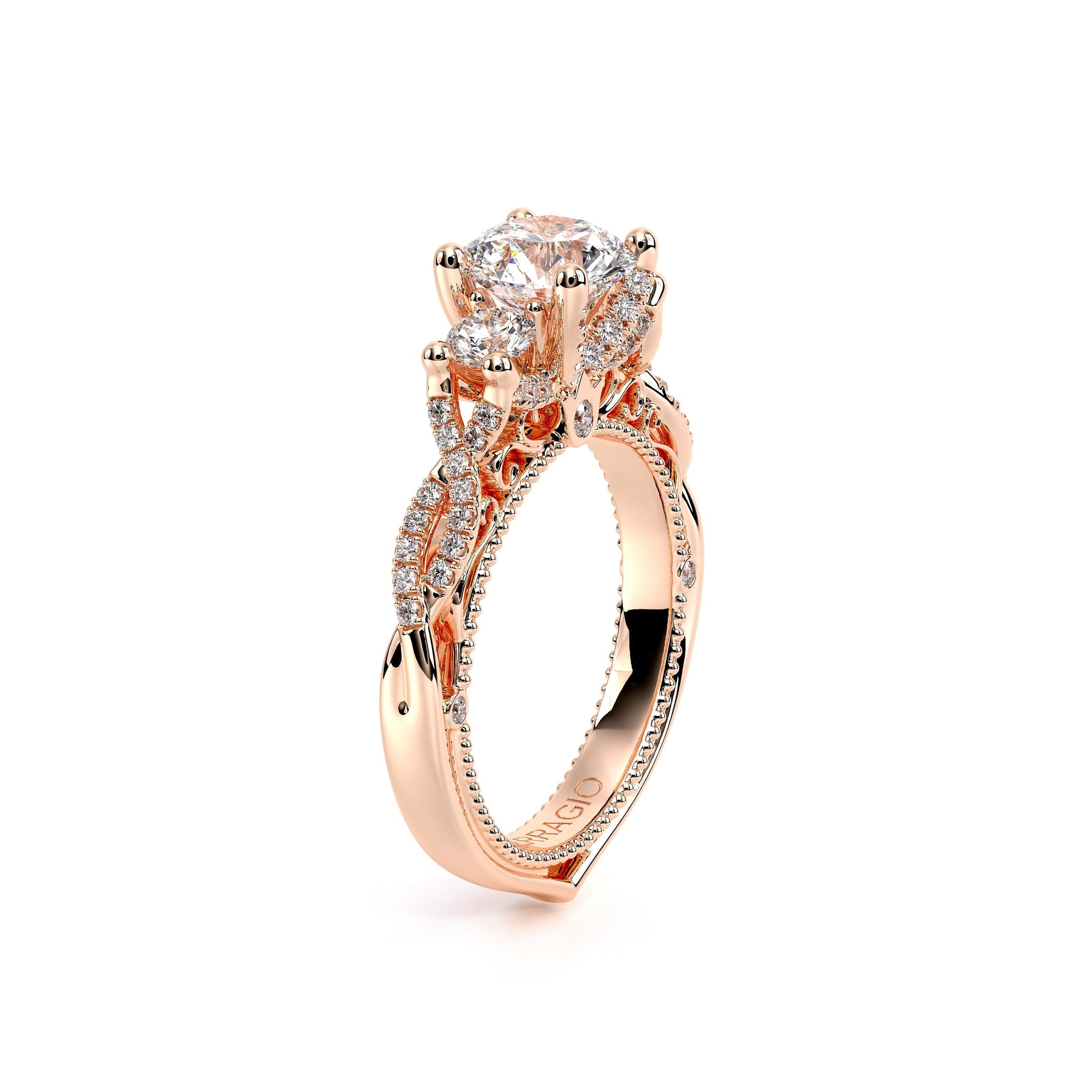 VENETIAN-5079R engagement ring from the Venetian Collection, features a vintage three stone round diamond prong setting, each encrusted with round brilliant diamonds. Our Verragio signature beading and lace detail beautifully binds together all elements and creates this visually stunning piece of art.