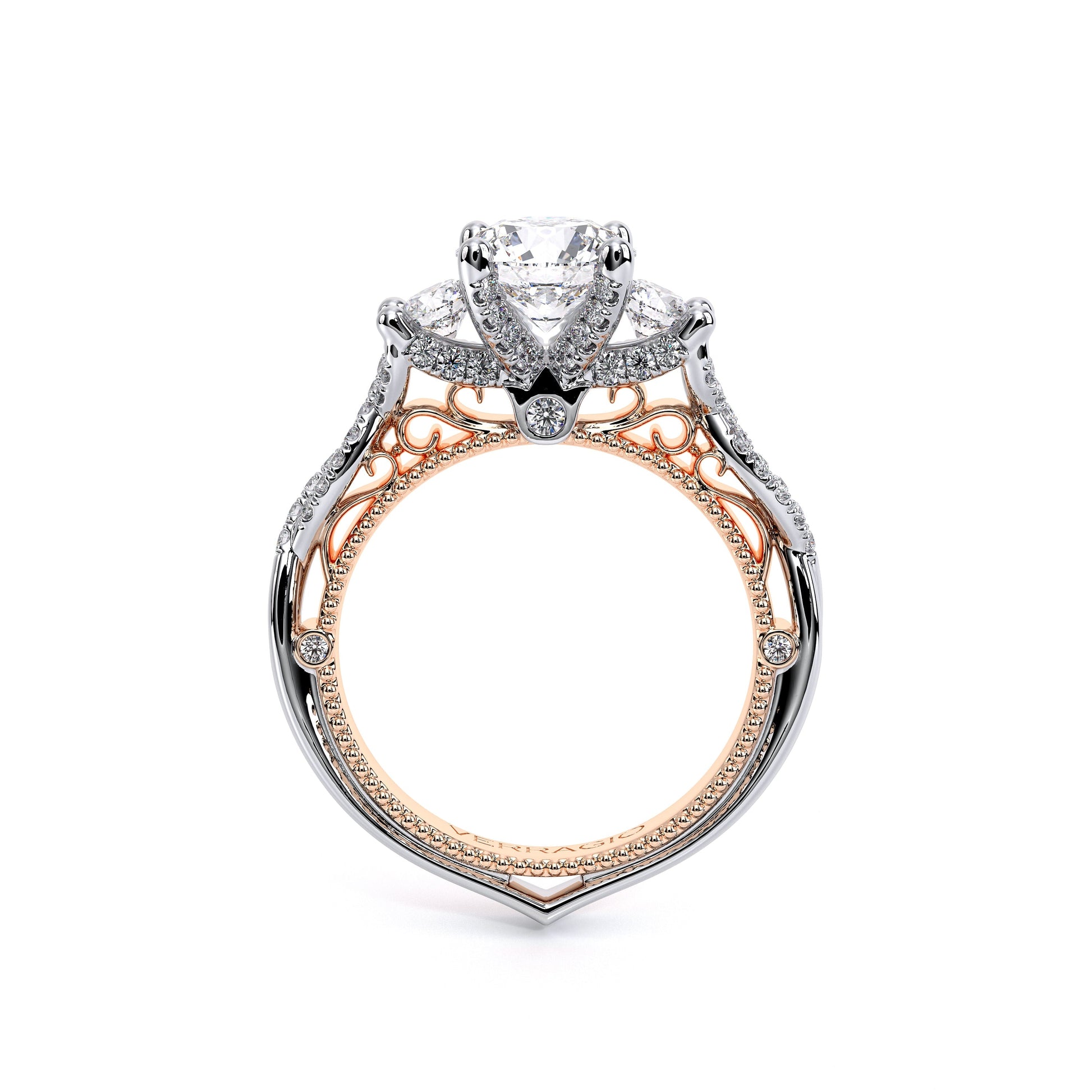 VENETIAN-5079R engagement ring from the Venetian Collection, features a vintage three stone round diamond prong setting, each encrusted with round brilliant diamonds. Our Verragio signature beading and lace detail beautifully binds together all elements and creates this visually stunning piece of art.