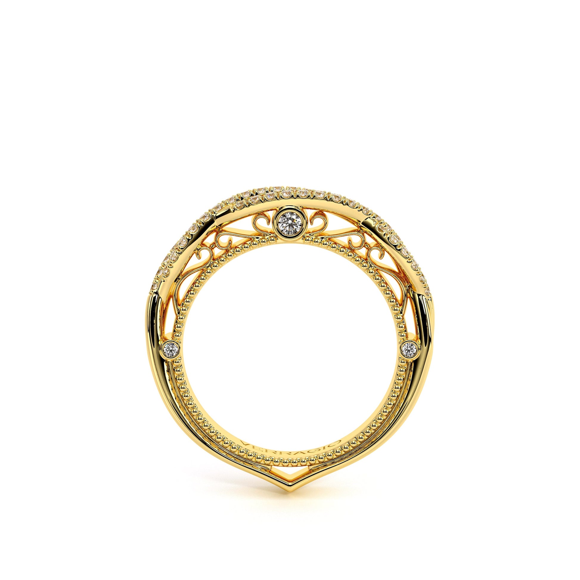 VENETIAN-5079W from the Venetian Collection, features a beautiful twisted band encrusted with round brilliant diamonds. The inner profile showcases three bezel set round diamonds infused seamlessly with our handcrafted lace and signature beading. Compliment your Verragio engagement ring by choosing either a twisted or a straight band.