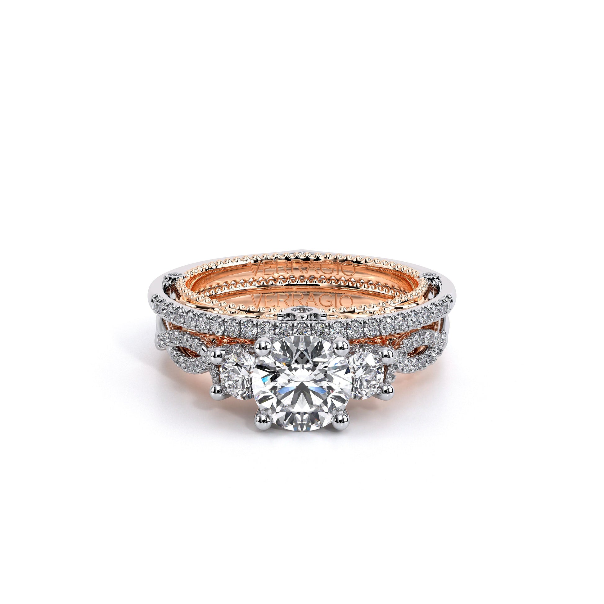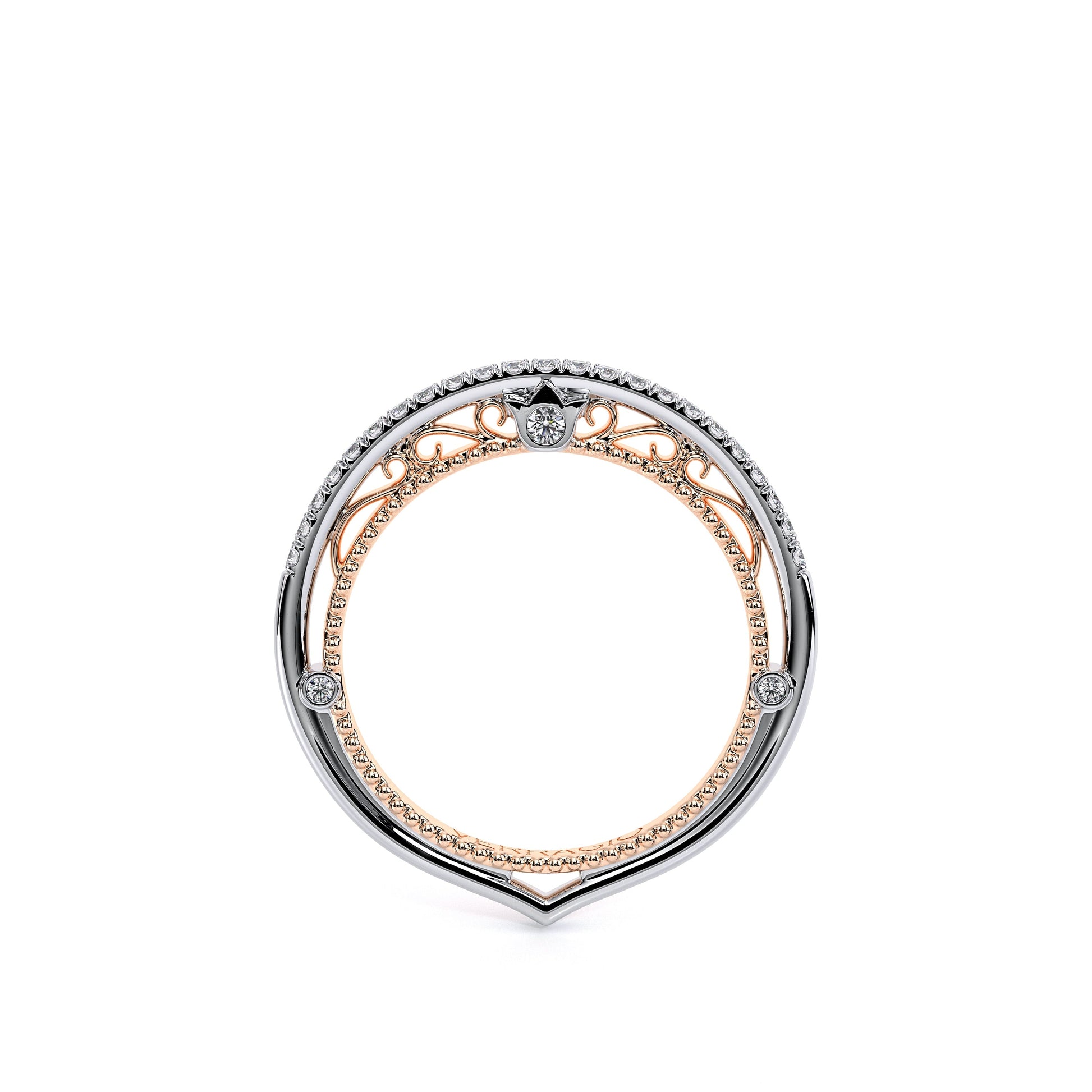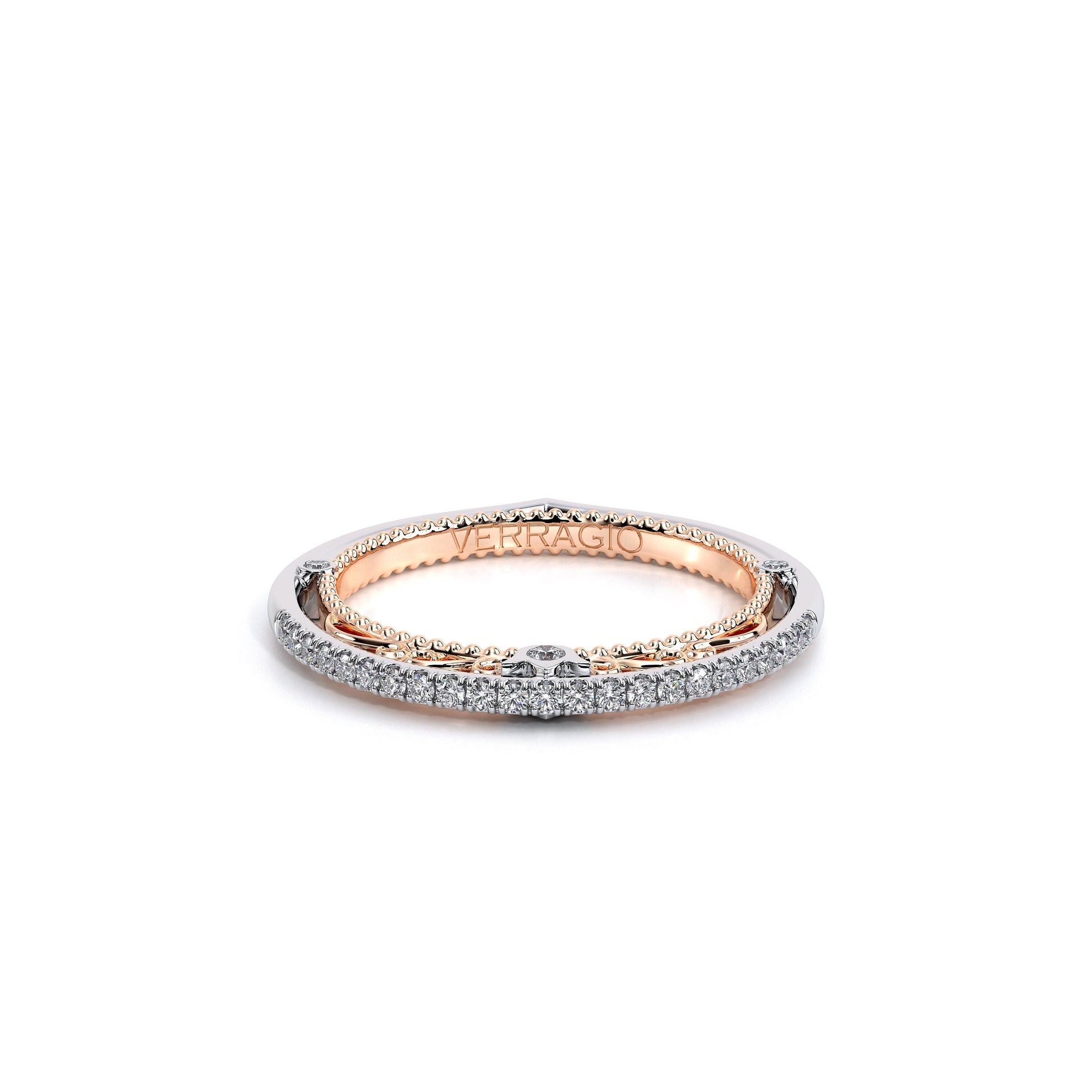 VENETIAN-5079WSB from the Venetian Collection, features a delicate straight band adorned with round brilliant diamonds. The inside profile showcases three bezel set round diamonds with our signature lace and beading. Complete your Verragio look by customizing your bridal set today.