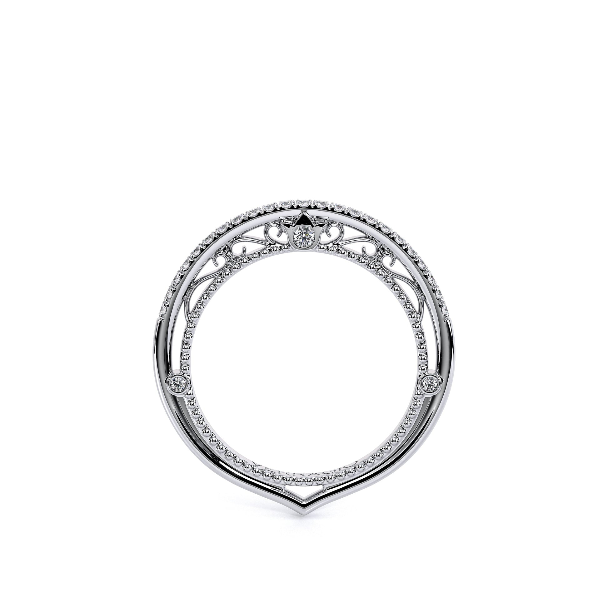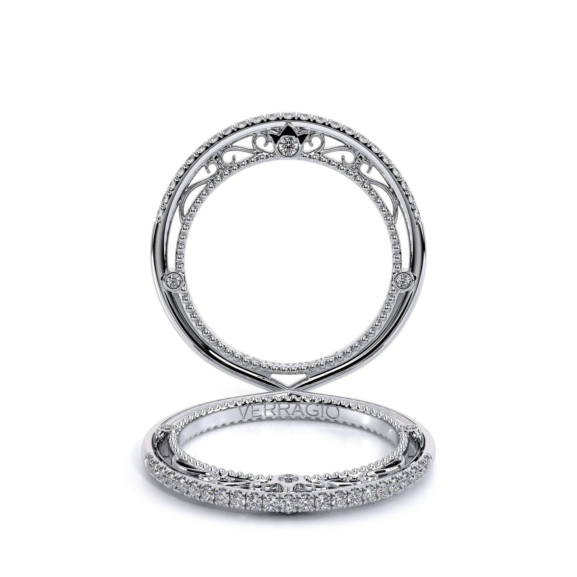 VENETIAN-5079WSB from the Venetian Collection, features a delicate straight band adorned with round brilliant diamonds. The inside profile showcases three bezel set round diamonds with our signature lace and beading. Complete your Verragio look by customizing your bridal set today.