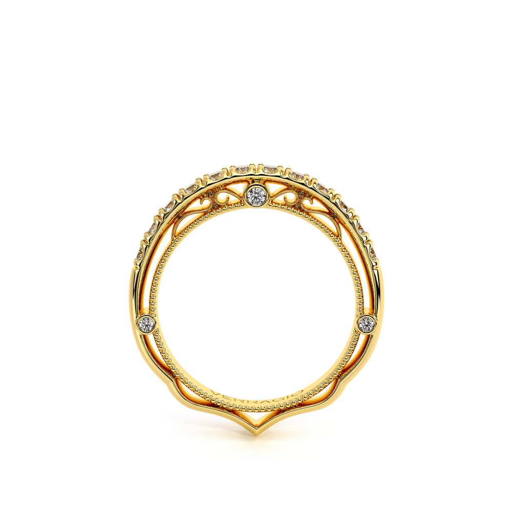 VENETIAN-5080W from the Venetian Collection, is a straight band featuring round brilliant diamonds. The inside profile showcases three bezels set round diamonds along with lace & signature beading. Complete your Verragio look by customizing your bridal set today.