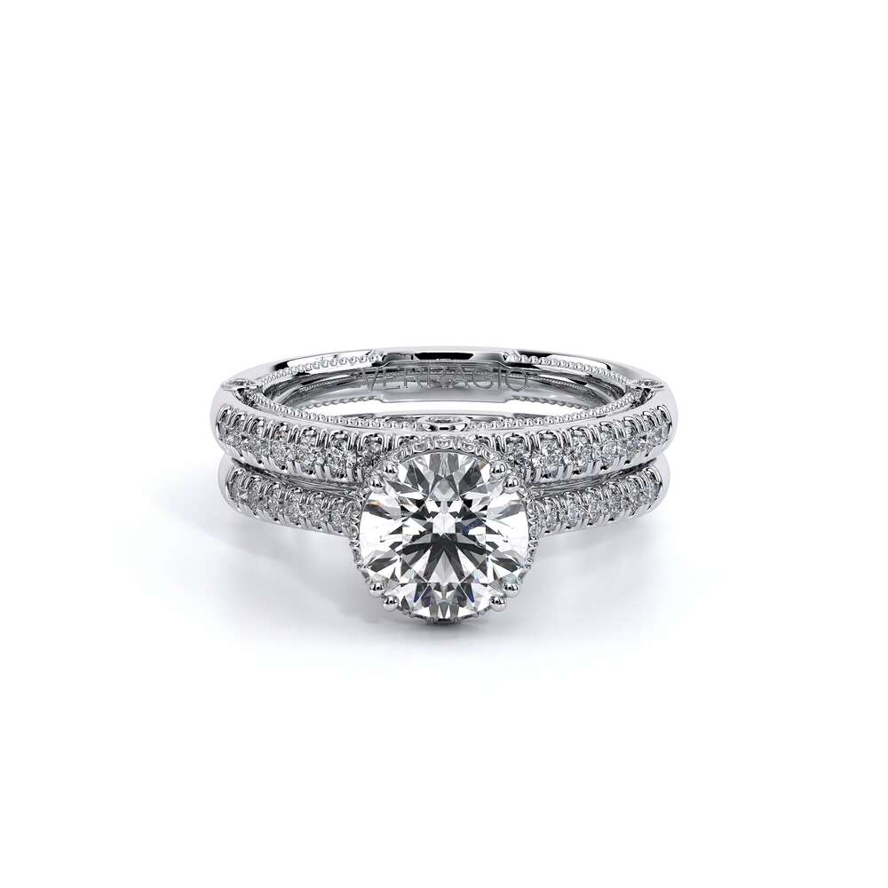 VENETIAN-5081W from the Venetian Collection, features a straight shank encrusted with round brilliant diamonds. The inside profile includes three bezels set round diamonds along with lace & signature beading to match with your engagement ring. Complete your Verragio look by customizing your bridal set today.