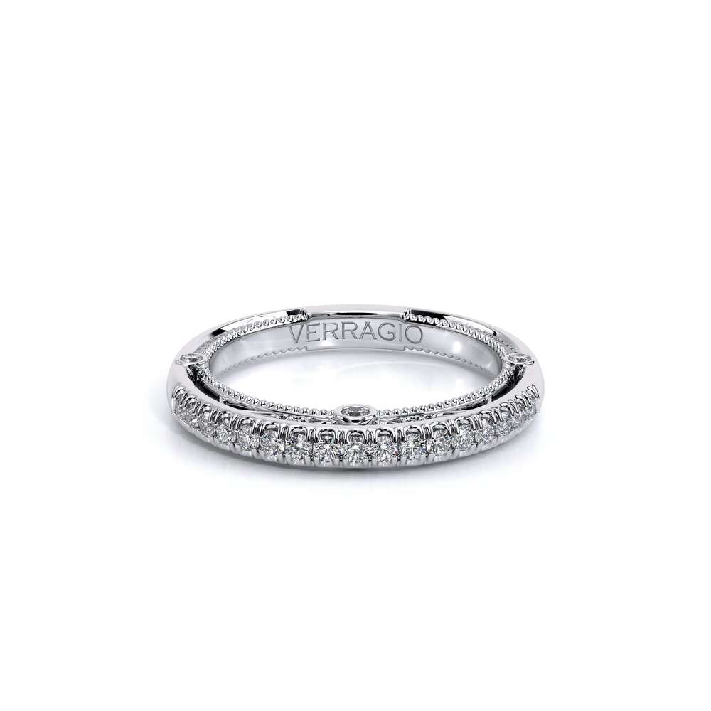 VENETIAN-5082W features a straight band adorned with round brilliant-cut diamonds. The inner profile showcases three bezels set round diamonds along with our signature beading and lace. Complete your Verragio look by customizing your bridal set today.