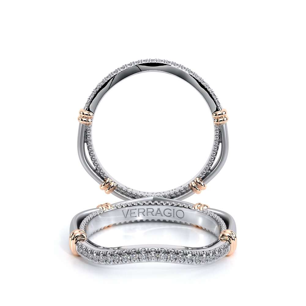 PARISIAN-117W is a thoughtfully designed contoured style wedding band that carries the Timeless rose gold wrap details of the Parisian collection create the perfect matching wedding set. **Note: +$400 for Beading in a different color