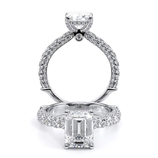 Couture-0489EM-2.5 is an elevated four-prong engagement ring featuring a diamond-bridge head designed to highlight your center stone. Meticulously-set round diamonds in a shared-prong setting wrap the elegant shank, enhanced with a pave-set three-quarter diamond riviera. The Verragio signature crest completes the statement look.