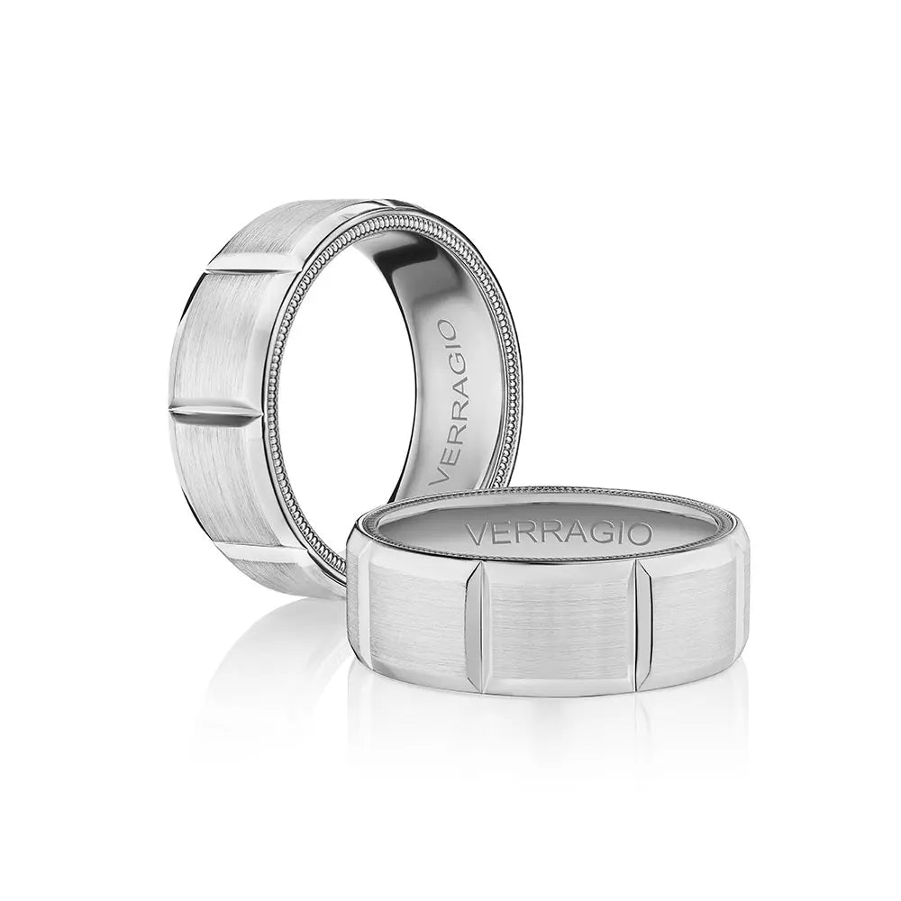 VW-8106 is our classic 8MM width men's band with a matte finish, accentuated with high polished edges. The modern geometric design carried throughout the ring is complimented by Verragio signature rose gold beading.